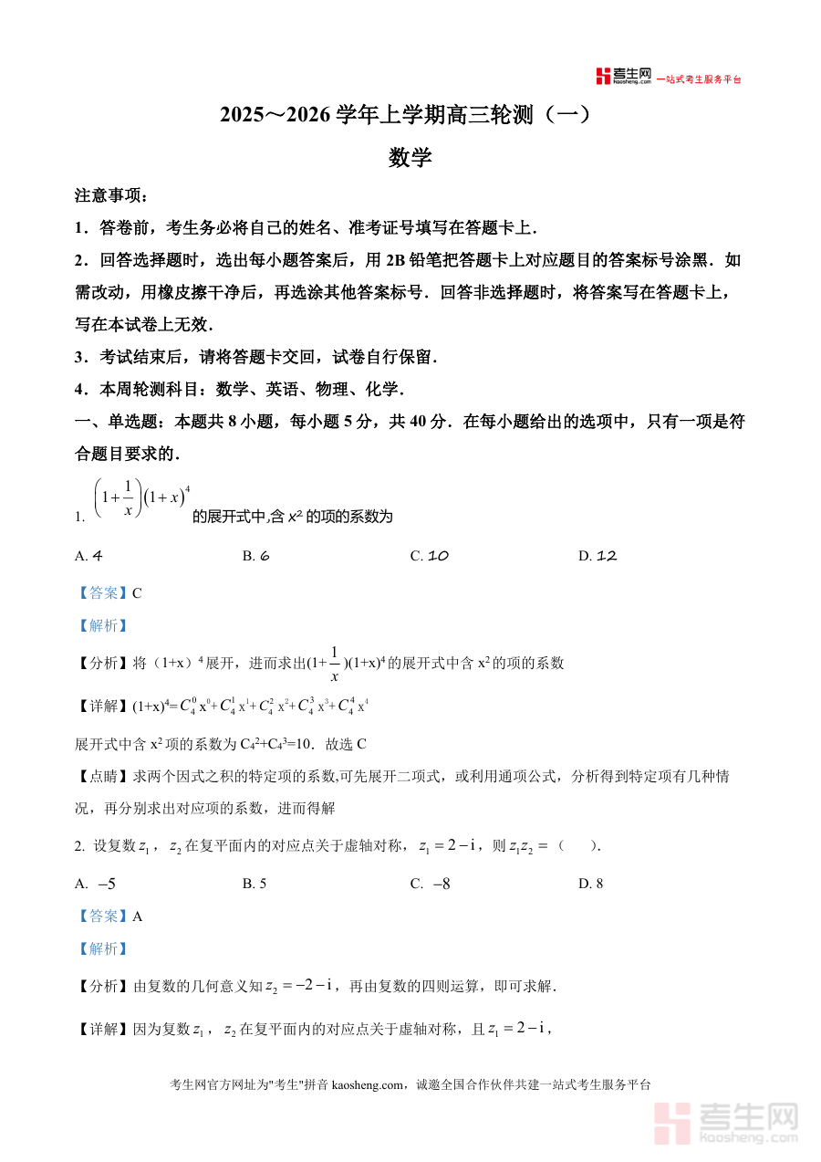本资料适用于云南省临沧地区及周边同类中学高三学生(尤其一轮复习需强化基础与解题技巧者)、高中数学教师及备考辅导人员。作为高三上学期首轮轮测配套解析,它是学生巩固一轮复习成果不可或缺的数据支撑材料——本地教学进度设计题型与难度梯度具有不可替代性;同时也是长期备考积累解题方法、构建系统知识体系、提升应试能力必不可少参考资源。