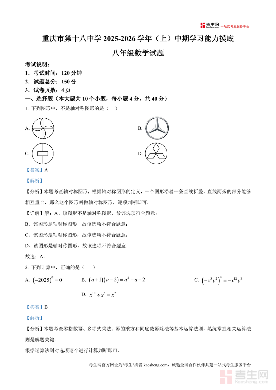 《精品解析:重庆市第十八中学2025-2026学年八年级上学期期中考试数学试题(解析版).docx》是一份针对八年级上学期数学阶段性学习评估需求打造专业备考资料。该资料完整收录该校期中数学试题全题型(含选择、填空、解答题),每道题目均配备详尽解析——不仅明确答案,更深度剖析考点(如轴对称图形判定、幂运算法则、全等三角形性质等),同时包含解题思路推导及易错点提示;特色在于紧密贴合该校教学进度与命题风格,融入重庆地区八年级数学核心知识模块,如含30°直角三角形性质应用、因式分解方法技巧等,助力使用者精准把握学习重点。