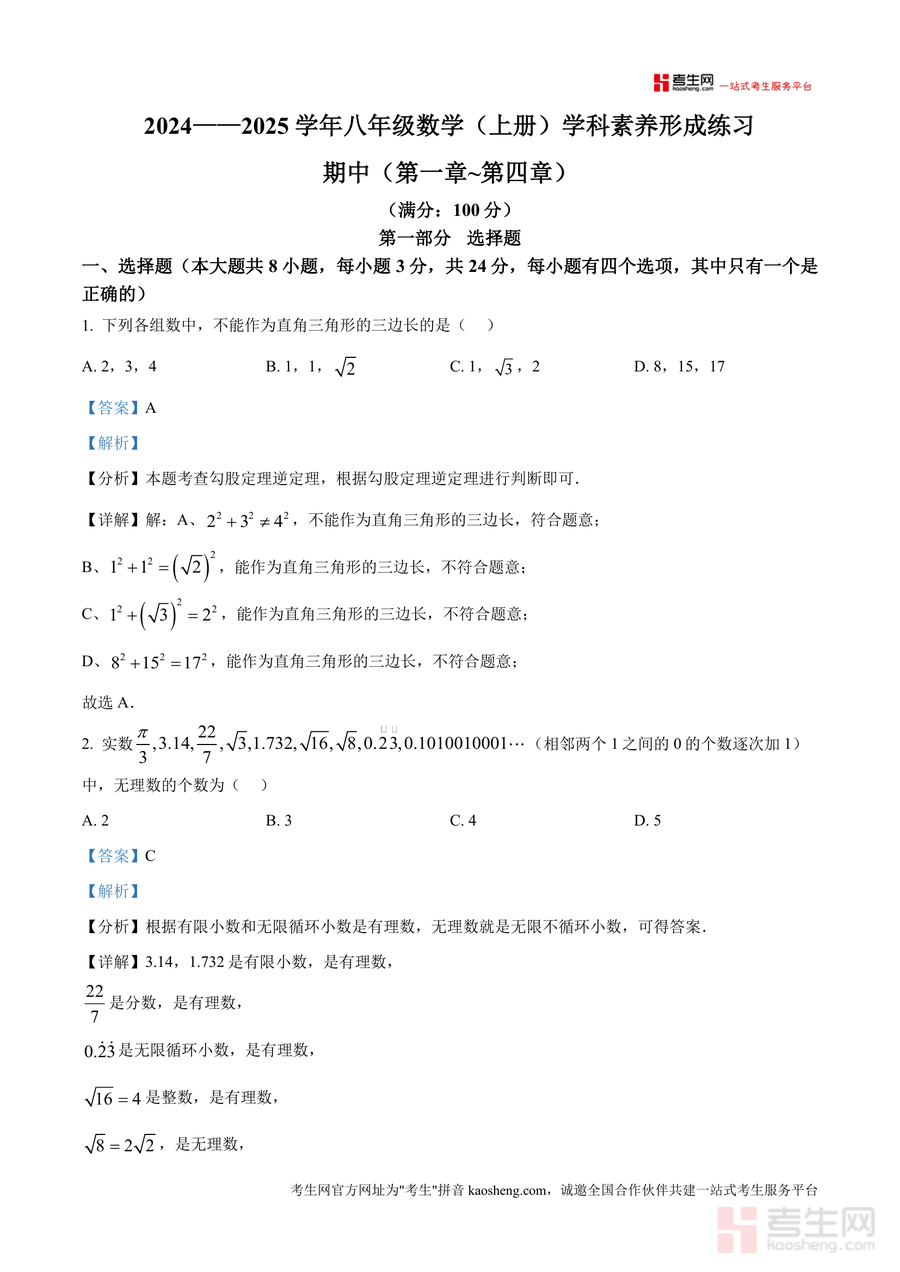 《精品解析:广东省深圳市龙岗区宏扬学校2024-2025学年八年级上学期11月期中数学试题(解析版).docx》是一份针对宏扬学校八年级上学期期中考试数学科目的精品备考资料。该资料覆盖第一章至第四章核心内容(勾股定理、实数、平面直角坐标系及一次函数),包含8道选择题、5道填空题及7道解答题全题型解析。特色亮点在于每道题均配备考点分析、详细解答步骤及易错点提示——如勾股定理逆定理应用、无理数判定、一次函数图像性质等高频考点解析精准到位,并结合本地校考命题规律设计,注重思维引导与方法迁移,帮助学生理解考点本质。