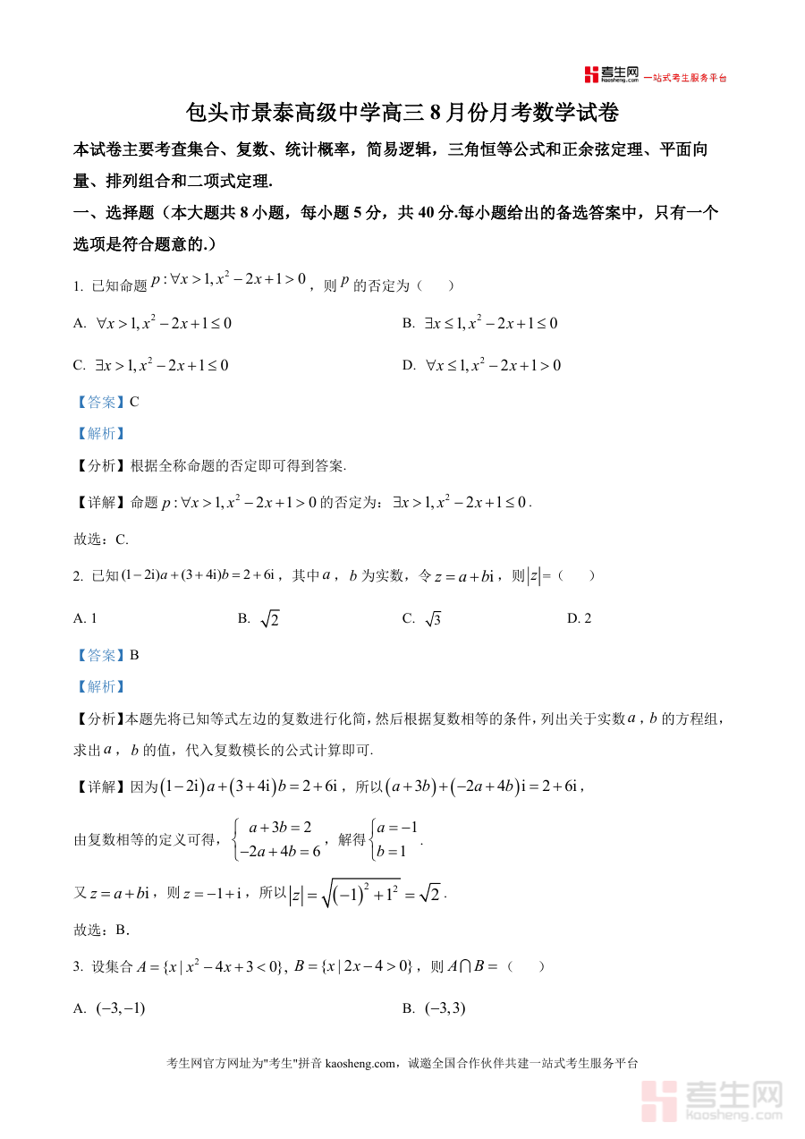 《精品解析:内蒙古包头市景泰高级中学2026届高三上学期8月份月考数学试卷(解析版)》是一份针对高三起始阶段数学核心考点精准备考资料。该资料基于景泰高级中学当月月考真题编制,覆盖集合与简易逻辑、复数运算、统计概率、三角恒等变换与正余弦定理、平面向量、排列组合与二项式定理等一轮复习重点模块;题型包含单选、多选、填空及解答题,全面匹配高考题型结构。其核心特色在于逐题提供详实解析,不仅给出正确答案,更通过"分析-详解-点睛"三步法拆解解题思路,如复数题结合复数相等条件推导参数,排列组合题运用"先组后排"策略,帮助学生掌握底层方法。