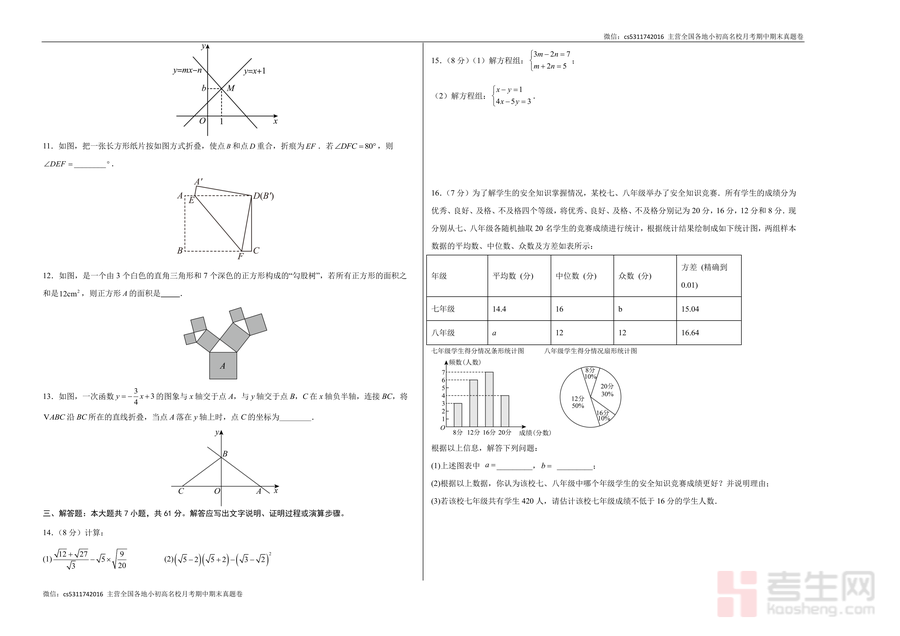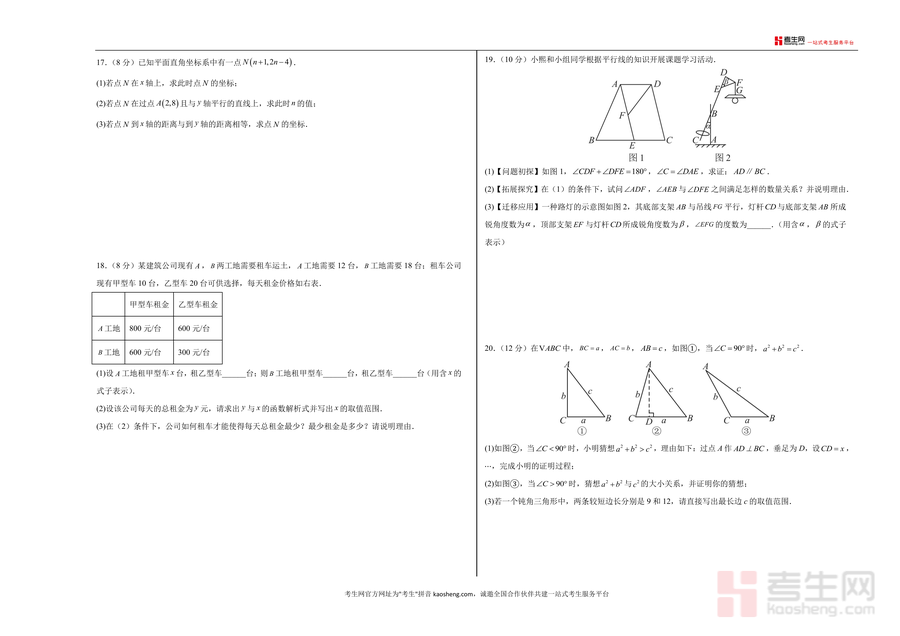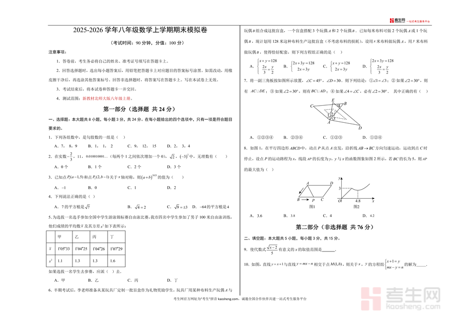 《八年级数学期末模拟卷【测试范围:新教材北师大版八上】(考试版A3)(深圳专用).docx》是一份针对深圳地区八年级学生量身打造的期末备考资料。它严格依据2025-2026学年新教材北师大版八年级上册教学大纲及深圳本地期末考命题要求编制,包含选择题(8小题共24分)、填空题(5小题共15分)、解答题(7小题共61分)三大题型,覆盖勾股数判定、无理数识别、坐标轴对称变换、方差应用、二元一次方程组配套问题、几何折叠与函数图像分析等核心知识点,采用考试版A3排版,完全模拟真实考场试卷格式,便于学生提前适应答题规范与卷面布局。