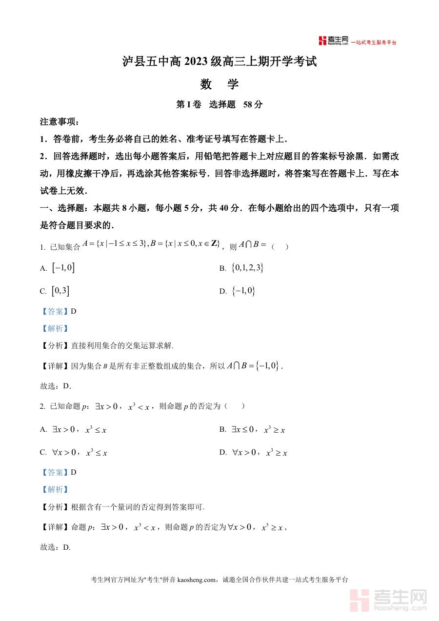 适用人群涵盖四川省泸县第五中学高2023级学生及省内同类高中高三学生、高中数学教师、高考备考指导人员;该资料必要性在于开学考试是高三阶段首个重要检测节点,能精准反映前期复习成效;不可替代性体现在针对该校学情的精准解析及真题资源稀缺性;长期价值在于积累下解题方法与考点认知可迁移至后续一轮二轮复习中持续发挥作用,是高三数学备考过程中不可或缺的数据支撑材料。