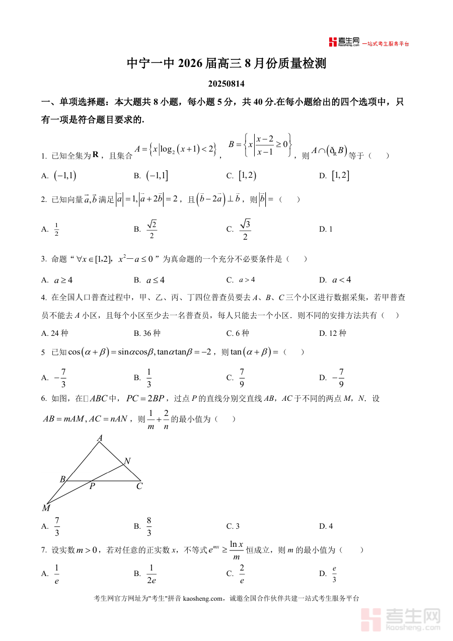 《精品解析:宁夏中卫市中宁县第一中学2025-2026学年高三8月份质量检测数学试题(原卷版)》是一份针对高三一轮复习初期设计的阶段性质量检测资料。该试题涵盖单项选择(8题)、多项选择(3题)、填空题(3题)及解答题(5题)四大题型,内容覆盖集合运算、向量运算、命题逻辑、排列组合、三角函数、圆锥曲线、数列递推、立体几何等高中数学核心模块。其特色亮点在于贴合宁夏中卫地区教学进度与学情,题型设置与高考真题结构高度一致,且融入如正态分布与化学实验误差结合、螺旋线与数列应用等跨学科情境题及创新题型,能有效考查学生知识迁移能力与综合思维。