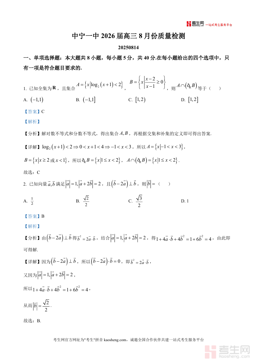 《精品解析:宁夏中卫市中宁县第一中学2025-2026学年高三8月份质量检测数学试题(解析版)》是一份针对高三学生一轮备考初期设计 的高质量真题解析资料,涵盖单项选择、多项选择、填空及解答四大题型共17道题目。内容覆盖集合运算、向量运算、命题逻辑、排列组合、三角函数变换、不等式恒成立问题、立体几何外接球及圆锥体积最值等核心知识点,特色亮点在于每道题均配备详细解题步骤与思路分析,如第7题通过构造函数并利用导数判断单调性解决不等式恒成立问题、第14题提供三种解法剖析函数零点问题,同时部分题目附有点睛提示,帮助学生理解考点本质。
