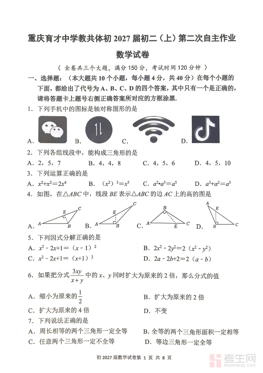 本资料适用于重庆市育才中学及周边同类学校的八年级学生、初中数学教师及关注孩子数学学习的家长群体。作为一份官方期中测试真题资料,它具有不可替代的权威性与参考价值,是学生期中备考不可或缺的关键素材;长期来看,通过对这份真题的深入练习与分析,学生能够建立起系统的知识框架,培养严谨的解题思维,为后续数学学习奠定坚实基础。