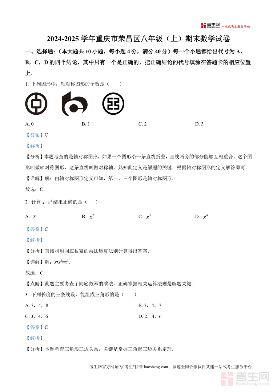 《精品解析:重庆市荣昌区2024-2025学年八年级上学期期末数学试卷(解析版)》是一份聚焦荣昌区八年级上学期数学期末考的真题深度解析类备考资料,包含完整试卷原题及所有题目的精细化解析内容。试卷题型覆盖10道选择题、8道填空题与8道解答题,考点涉及轴对称图形判定、全等三角形证明、分式运算、因式分解等八年级上核心知识模块;解析部分除明确答案外,还详细呈现考点定位(如选择题第3题三角形三边关系定理应用)、解题步骤推导及易错点警示,帮助学生从根源理解知识应用逻辑而非单纯记背结论。