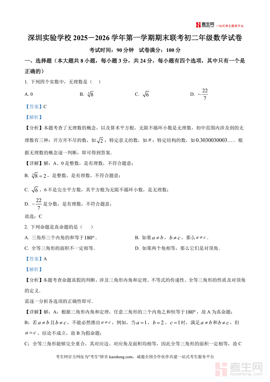 《精品解析:广东省深圳实验学校初中部2025-2026学年八年级上学期期末数学试卷(解析版).docx》是一份针对深圳实验学校初中部八年级学生设计优化的期末备考资料,包含完整试卷原题及逐题深度解析。资料覆盖八年级上册数学核心知识点,如无理数判定、三角形内角和定理、一次函数图像象限判断等,并结合本校命题特色设置题目。解析部分不仅给出标准答案,还详细剖析考点关联、解题思路推导及常见易错点,帮助学生理解知识本质而非机械记忆,是兼具真题参考性与解析专业性的数据资料。