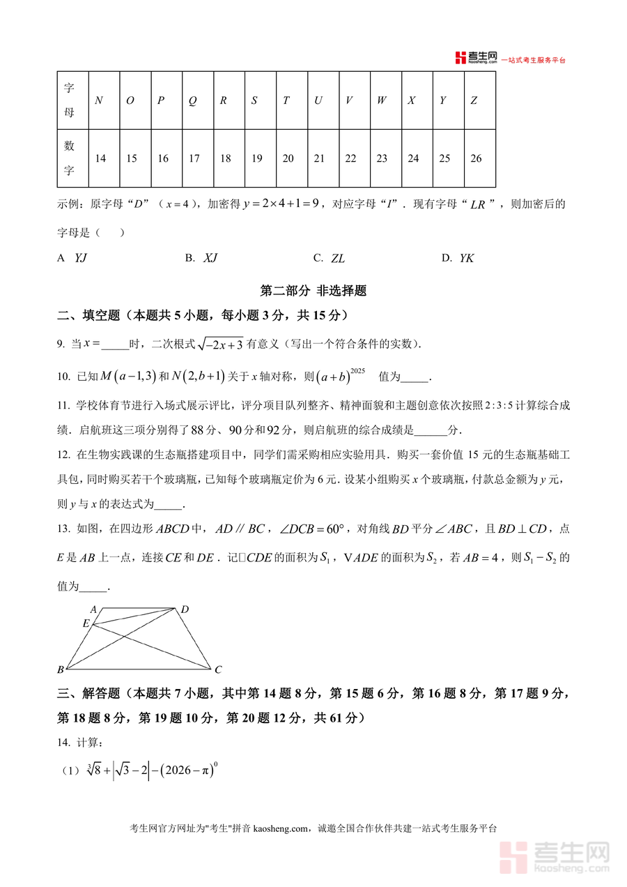 《精品解析:广东省深圳市宝安区2025-2026学年八年级上学期1月期末数学试题(原卷版).docx》是一份面向广东省深圳市宝安区八年级学生及教师群体的权威期末数学备考资料。该资料包含该学年第一学期学业质量监测数学科目的完整试题,题型涵盖选择题(8小题共24分)、填空题(5小题共15分)、解答题(7小题共61分),考查勾股定理、二元一次方程组、统计量(众数、四分位数)、平面直角坐标系等核心知识点。其特色亮点在于严格遵循本地考试说明规范,保留原题答题要求(如答题卡填涂规则)与排版格式,为使用者提供原汁原味的考试场景还原,助力快速适应本地考试形式。