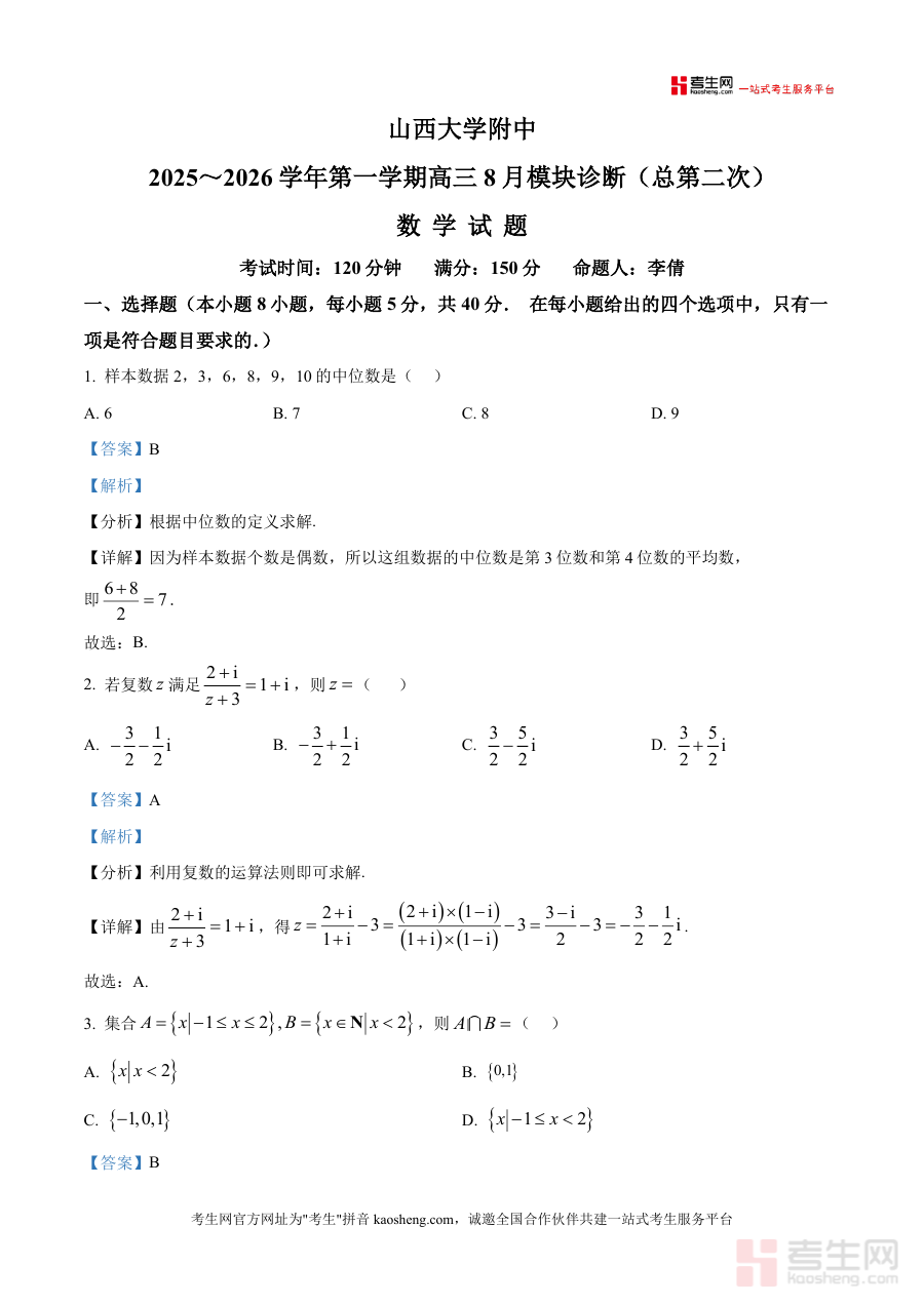 《精品解析:山西省山西大学附属中学校2025-2026学年高三上学期8月月考数学试题(解析版)》是一份针对高三数学一轮复习阶段设计的高质量真题解析备考资料。资料包含完整月考数学试题(含8道选择题、3道多选题、3道填空题及5道解答题)及配套详细解析,覆盖集合、复数、数列、三角函数、圆锥曲线、导数等高考核心知识模块。特色亮点在于解析由命题人李倩老师亲自撰写,每道题均包含考点分析、步骤详解及方法点睛,例如对中位数计算定义的解读、复数运算规则应用、导数极值点分类讨论等,精准呈现解题逻辑与得分要点,体现真题解析资料对知识点深度拆解与专业指导价值。