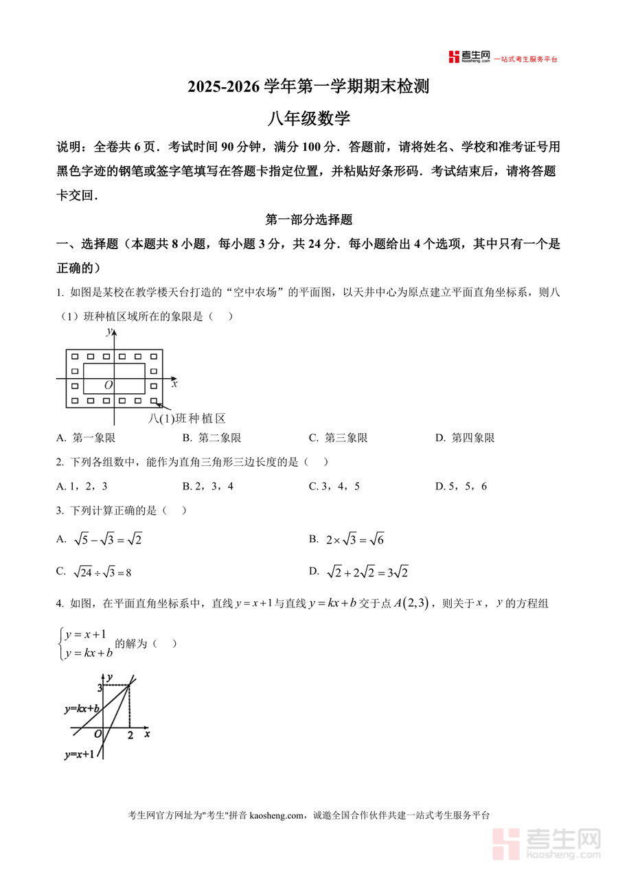 《精品解析:广东省深圳市福田区2025-2026学年八年级上学期1月期末数学试题(原卷版).docx》是一份针对该区域八年级学生期末备考设计的权威真题资料,包含完整的第一学期期末数学检测试题,涵盖选择题、填空题及解答题三大题型,全面覆盖平面直角坐标系、勾股定理、一次函数、方程组等核心知识点,贴合当地教学大纲与考试命题趋势,具有较强的针对性与实用性。