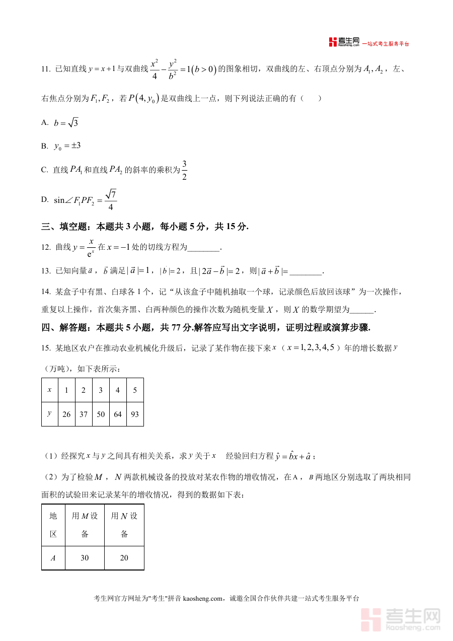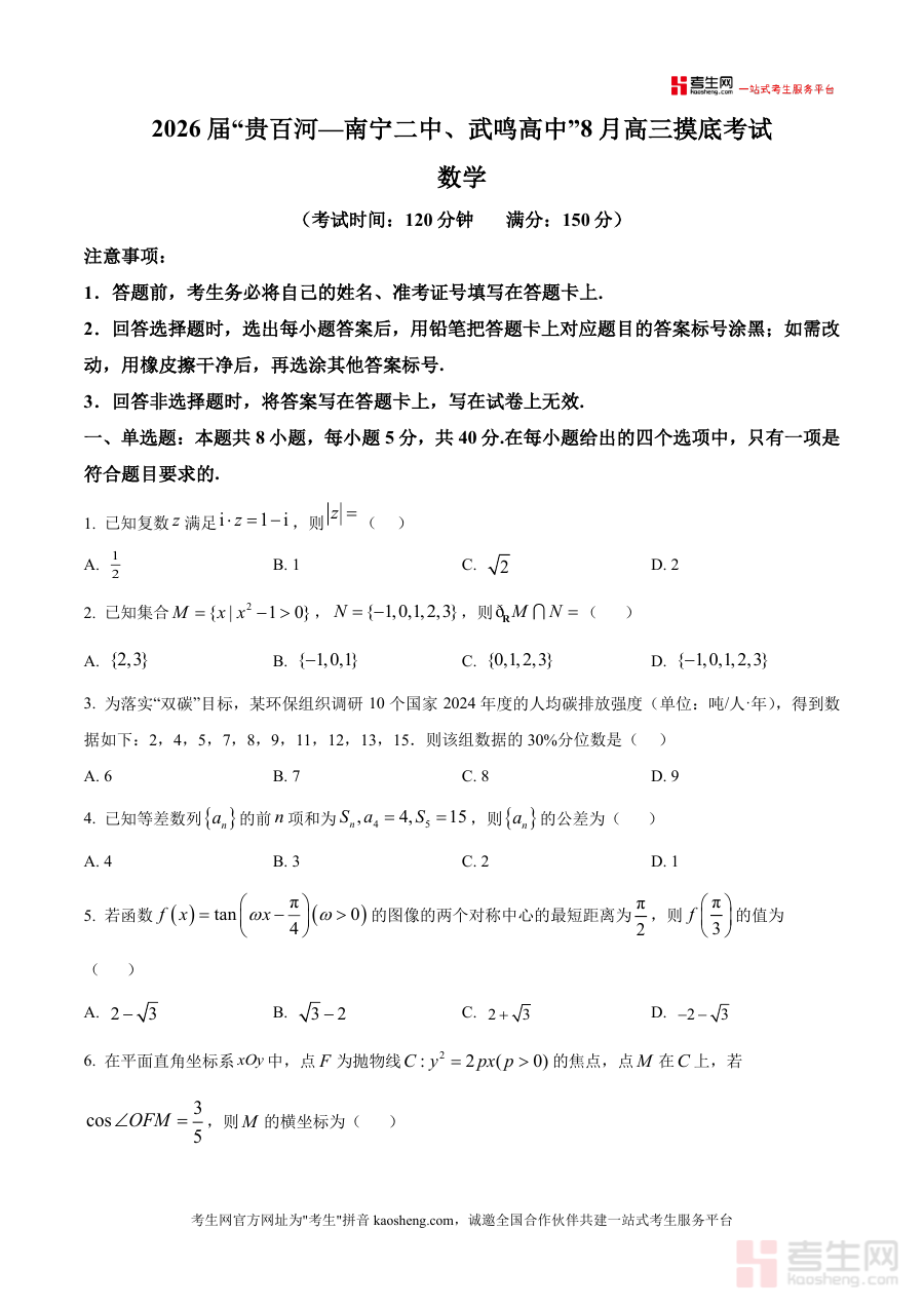 《精品解析:广西壮族自治区贵百河—南宁二中、武鸣高中2026届高三上学期8月摸底考试数学试题(原卷版)》是一份面向2026届高三学生的开学摸底考试数学原卷资料,由南宁二中与武鸣高中联合命题设计。该试题严格遵循高考数学考纲要求,涵盖复数运算、集合运算、统计分位数、等差数列、三角函数图像性质、抛物线焦点问题、函数奇偶性与单调性等核心知识点;题型结构完整,包含单选题8小题(40分)、多选题3小题(18分)、填空题3小题(15分)及解答题5小题(77分),全面覆盖高考数学常见题型与考点分布。其特色在于结合"双碳"目标等现实背景设计统计类题目,融入生活情境与学科交叉元素,既考查基础知识又体现应用能力,同时保持了名校命题的严谨性与创新性。