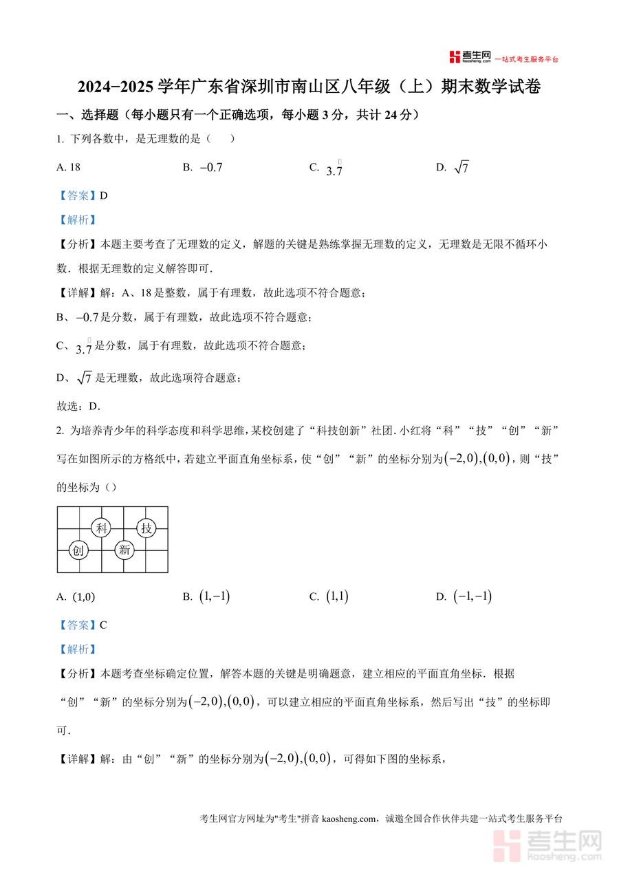 《精品解析:广东省深圳市南山区2024-2025学年八年级上学期期末数学试卷(解析版)》是一份针对南山区八年级数学期末考情设计专业备考资料,涵盖选择题(如无理数判断、勾股定理逆定理应用)、填空题(如坐标确定位置、海伦-秦九韶公式计算)及解答题(如二次根式混合运算、二元一次方程组求解)全题型详细解析。资料通过精准标注考点类型,结合每题详细解题步骤与思路点拨(如利用网格图判断三角形形状时的勾股定理应用、一次函数与二元一次方程组的关联推导),帮助使用者快速把握核心知识点与题型规律。其特色在于贴合本地命题趋势,解析过程注重逻辑推导与方法总结,为学生提供可复制性强的解题策略。