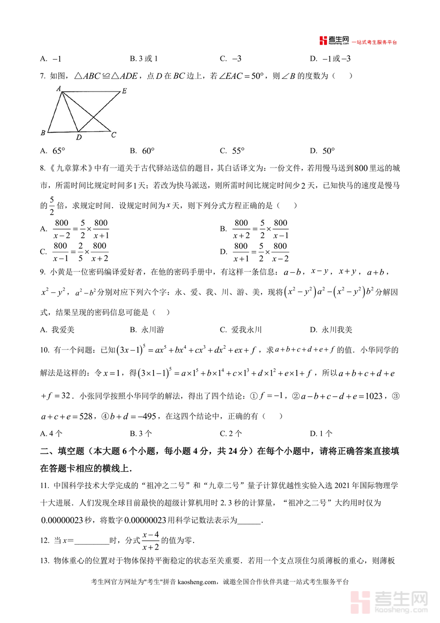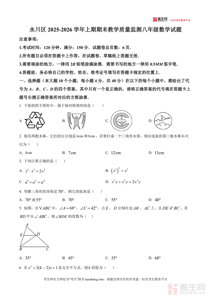 《精品解析:重庆市永川区2025-2026学年八年级上学期1月期末数学试题(原卷版)》是一份严格依据永川区教育质量监测标准编制的八年级数学期末真题原卷资料,核心定位为服务当地学生期末备考需求。主要内容覆盖初中数学八年级上册核心知识点与技能要求,题型结构包含选择题(10小题共40分)、填空题(6小题共24分)及解答题(9小题共86分),涵盖轴对称图形判断、三角形三边关系应用、因式分解运算等高频考点;特色亮点在于完全还原考试时长(120分钟)与答题规范(答题卡填涂要求等)细节,并融入本土命题特色元素,为使用者提供沉浸式真题体验。