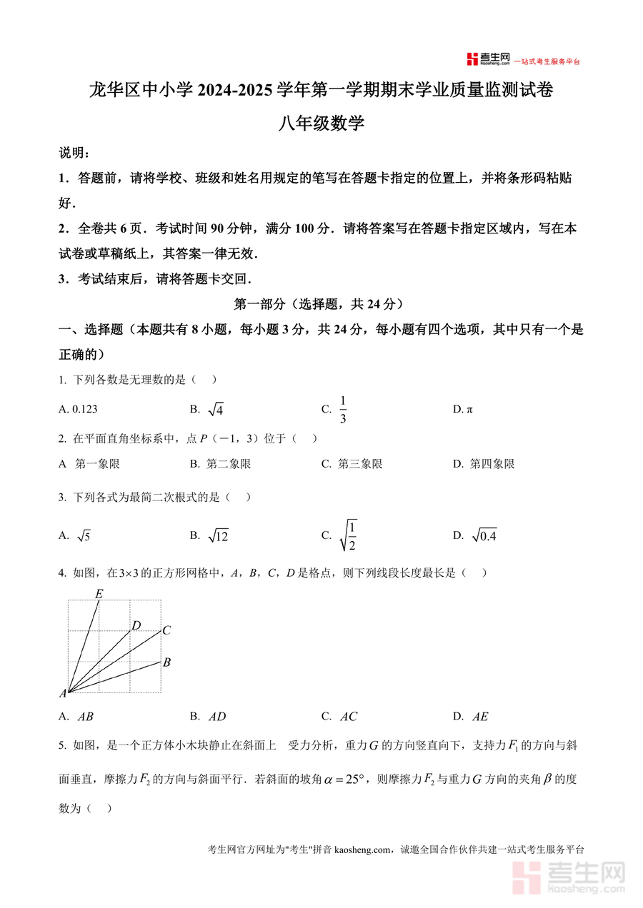 《精品解析:广东省深圳市龙华区2024-2025学年上学期八年级期末考试数学试卷(原卷版).docx》是一份针对深圳市龙华区八年级上学期数学期末学业质量监测的官方原卷资料,聚焦区域教学要求与学生学业水平评估需求。试卷涵盖选择题(8小题共24分)、填空题(5小题共15分)、解答题(7小题共61分)三大题型,内容覆盖无理数识别、平面直角坐标系点位置判断、最简二次根式判定、几何图形长度计算、统计量分析、方程组应用、空气质量数据统计决策等八年级上册数学核心知识点。其特色在于严格遵循当地期末考命题规范,题型分布合理,难度梯度清晰,能真实反映区域教学重点与考试趋势。