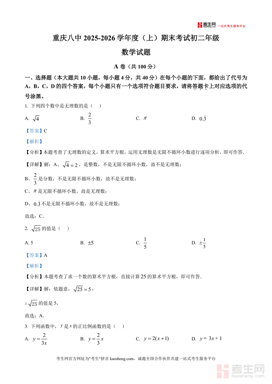 《精品解析:重庆市第八中学校2025-2026学年上学期期末考试八年级数学试题(解析版).docx》是一份针对重庆八中八年级上学期数学期末考情设计的权威真题解析类备考资料。文件覆盖该校A卷全题型内容(选择题10道、填空题4道、解答题5道),每道题目均配备深度解析——不仅标注核心考点如无理数定义、正比例函数判定、勾股定理逆定理等,还通过“考点分析+分步详解”双模块拆解解题逻辑,例如选择题中对无理数特性的逐项验证、解答题中代入消元法与分式化简的步骤演示,帮助学生精准把握考点应用场景与解题规范。