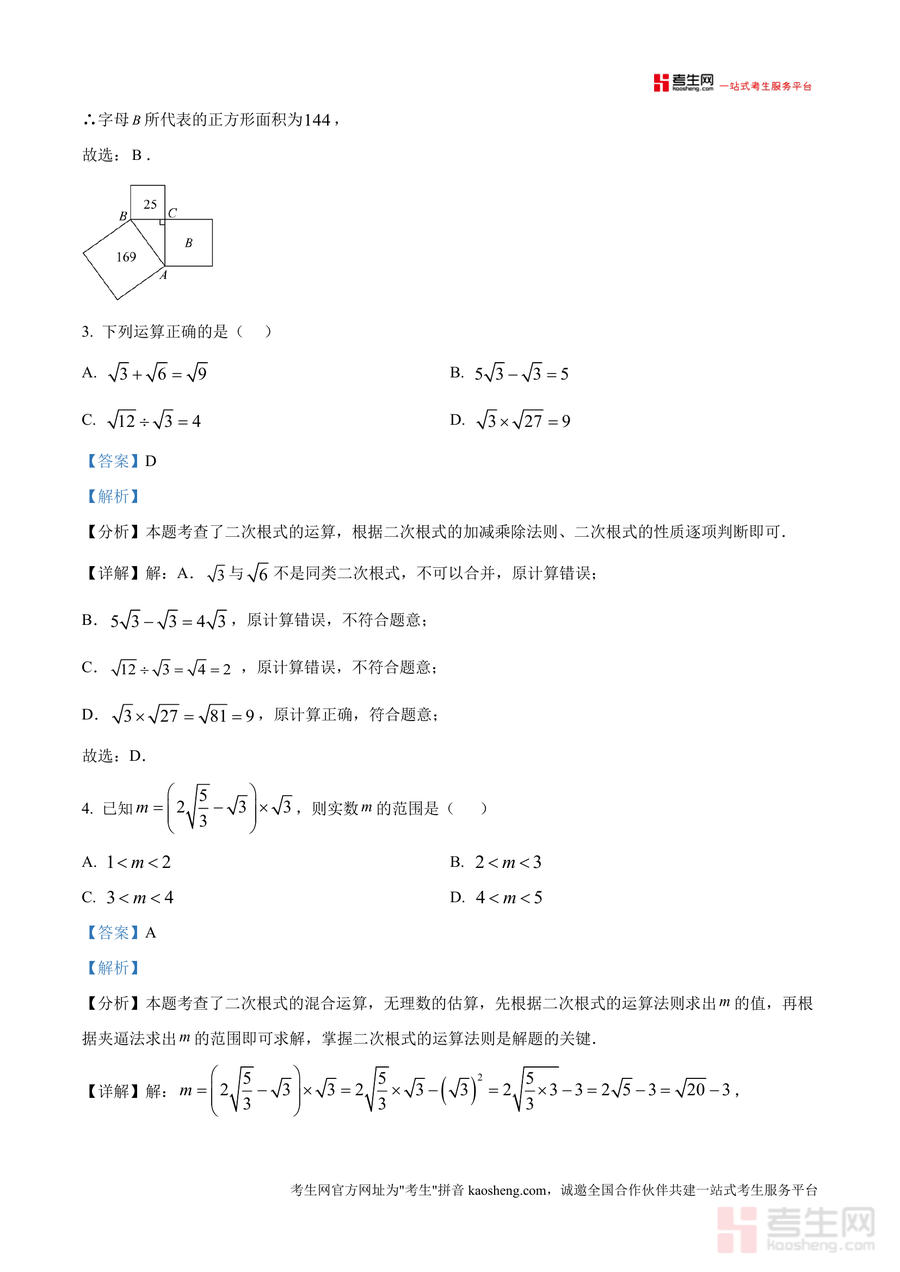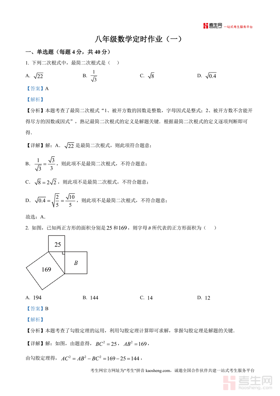 《精品解析:重庆市第二十九中学校2024—2025学年下学期八年级数学月考试卷(解析版)》是一份聚焦八年级下学期数学核心考点、结合重庆二十九中真实月考情境编制而成真题解析资料。资料覆盖单选题、填空题、解答题三大题型,全面考查二次根式运算、勾股定理应用、特殊四边形性质等核心知识点。特色亮点在于每道题均配备详尽解析:不仅明确考点定位(如"最简二次根式定义""勾股定理与最短路径问题"),还通过分步推导展示解题逻辑,并补充易错点提示与方法归纳,帮助学生深化对知识点理解而非单纯记忆答案,有效提升知识运用能力。