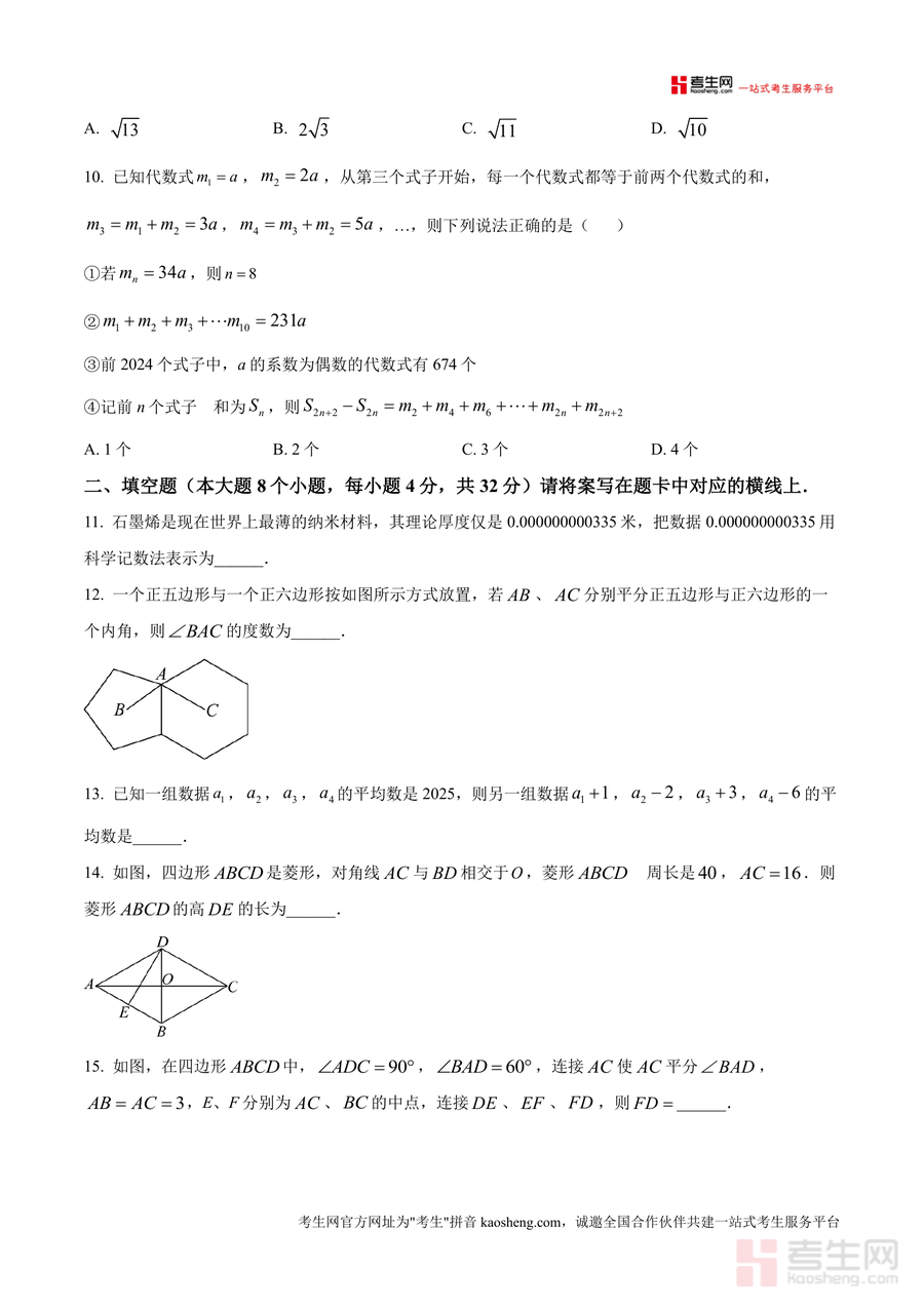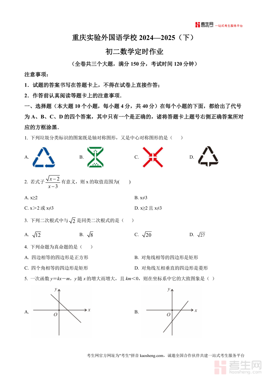 《精品解析:重庆市九龙坡区四川外国语大学附属学校2024-2025学年八年级下学期第一次月考数学试卷(原卷版)》是一份针对该校八年级学生阶段性数学学习成果评估设计的权威备考资料。试卷严格遵循重庆本地初中数学教学大纲要求,涵盖二次根式、一次函数、四边形等核心知识点;结构完整包含选择题(10题40分)、填空题(8题32分)及解答题(8题78分)三个大题,满分150分且考试时间设定为120分钟;特色亮点在于贴合该校教学进度与重庆地区中考命题趋势,能真实还原月考考试场景,为使用者提供精准有效的练习素材。