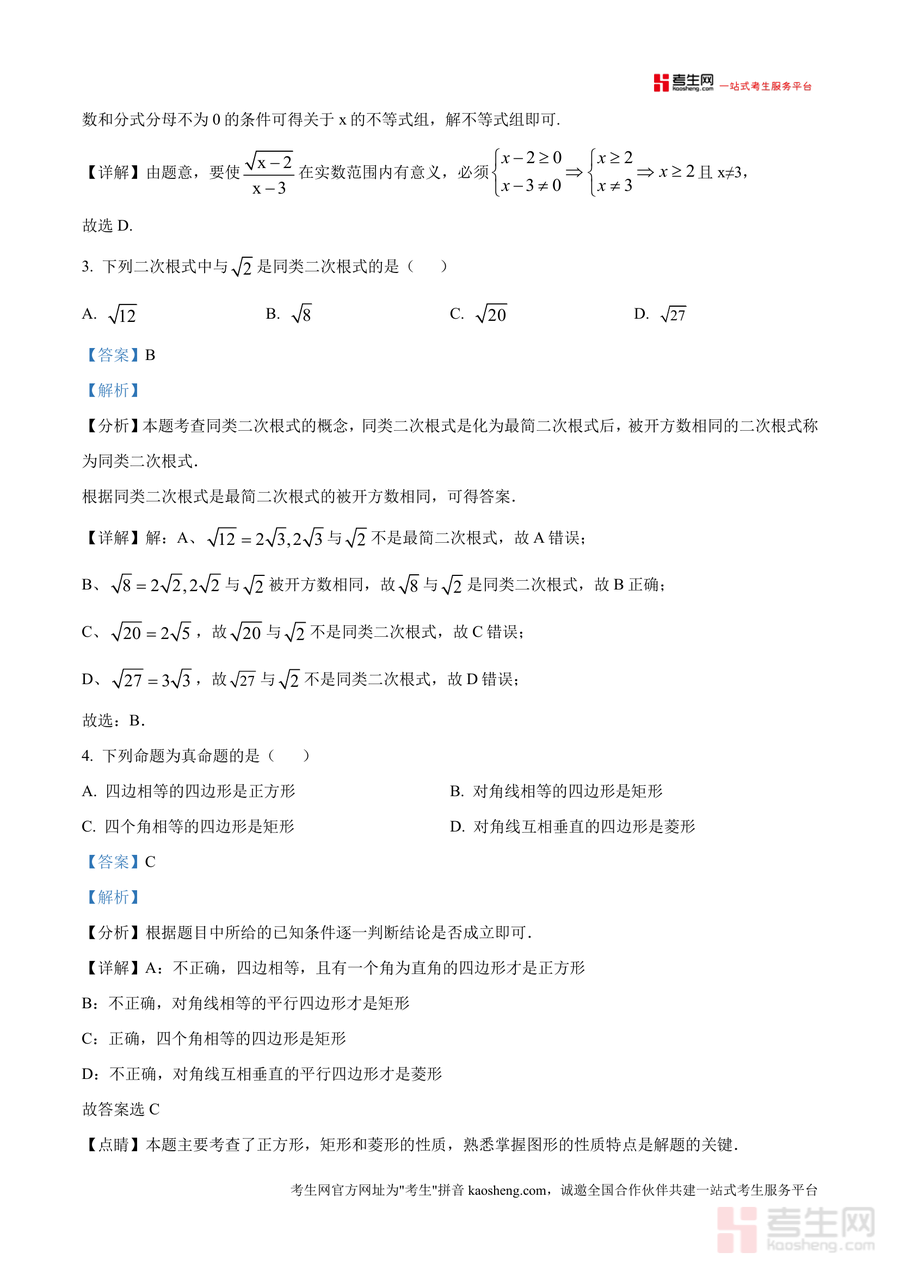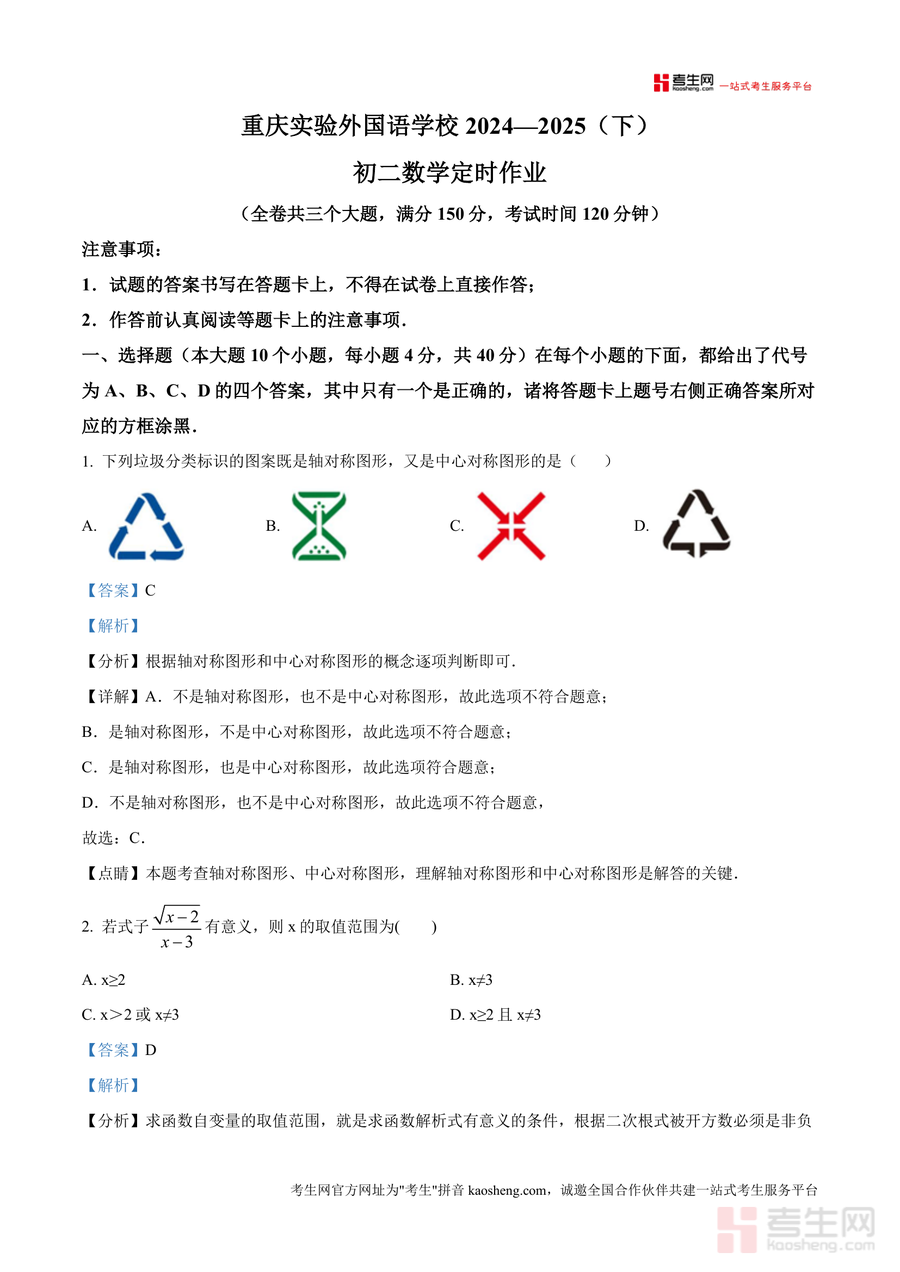 《精品解析:重庆市九龙坡区四川外国语大学附属学校2024-2025学年八年级下学期第一次月考数学试卷(解析版).docx》是一份针对重庆实验外国语学校八年级下学期数学阶段性测评设计精准化备考资料。该资料完整呈现全卷三大题(选择题10道、填空题8道及后续大题)共18道核心题型,覆盖轴对称图形与中心对称图形判断、二次根式意义及同类二次根式识别等八年级下册重点考点;解析部分采用"考点分析-步骤详解-易错点睛"结构,标注每题对应的知识模块与解题方法,贴合该校学情及命题风格,为学生提供清晰解题路径。