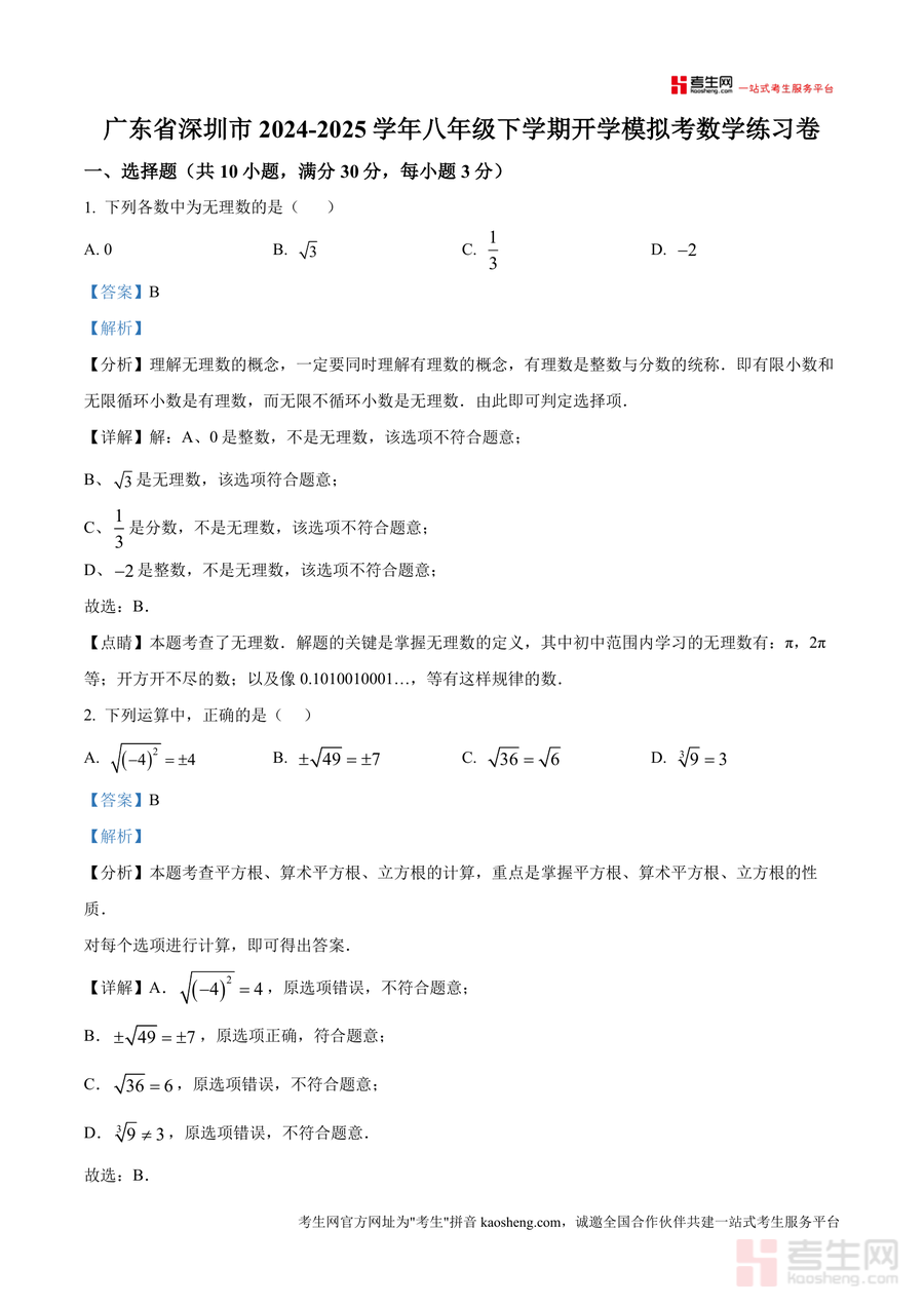 《精品解析:广东省深圳市2024-2025学年八年级下学期开学适应性模拟考数学练习卷(解析版).docx》是一份针对深圳地区八年级学生设计开发的优质备考资料。该练习卷严格遵循深圳市数学教学大纲要求,涵盖了无理数概念辨析、平方根与立方根运算、平行线性质应用等核心知识点,通过精心设计的10道选择题、5道填空题和7道解答题全面考察学生的数学基础与解题能力。每份题目均配备详细解析,不仅给出标准答案,还深入分析解题思路、考点分布及易错点,体现了真题解析资料应有的专业性和实用性。