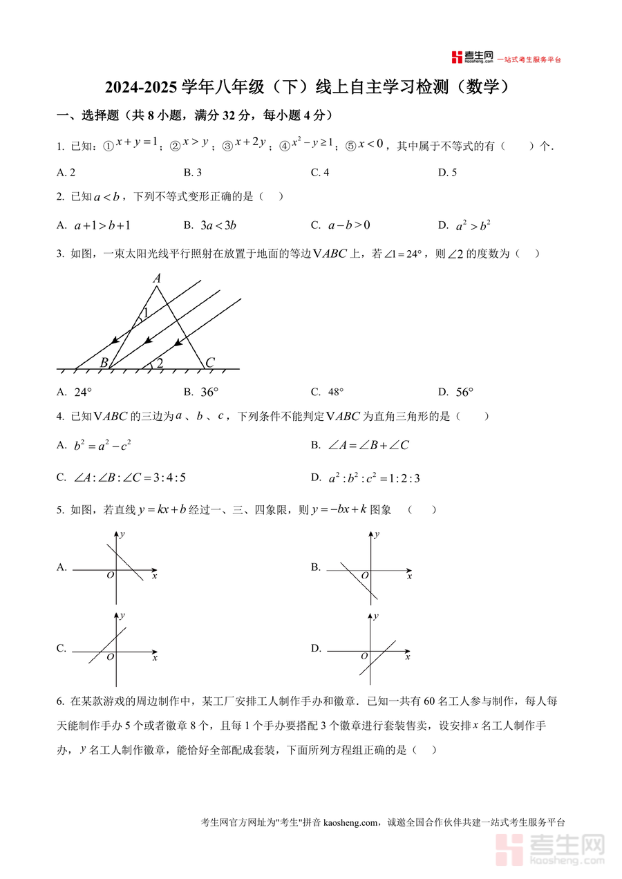 《精品解析:广东省深圳市福田区红岭中学2024-2025学年下学期八年级数学开学考试卷(原卷版).docx》是一份针对深圳福田区八年级学生数学开学检测的权威备考资料。该试卷包含选择题(8小题)、填空题(5小题)及解答题(5小题)三大题型,覆盖不等式识别与变形、几何图形角度计算、直角三角形判定、函数图像分析、方程组应用等八年级数学核心知识点;题型设计贴合红岭中学这类重点校的命题风格,题目设置兼顾基础与能力提升,能全面反映学生寒假自主学习效果及知识掌握程度。