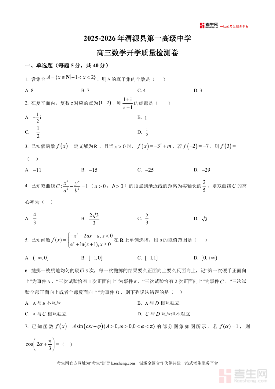 该资料适用于渭源县第一中学及周边地区高三学生、高中数学教师以及关注学生数学备考进展的家长群体。作为开学质量检测的权威原卷版资料,它具有不可替代性——能够真实反映本地学校对高三学生开学阶段的知识要求与能力标准;其长期价值在于可为学生后续一轮复习提供基础数据支撑,并帮助师生制定更科学高效的复习计划。