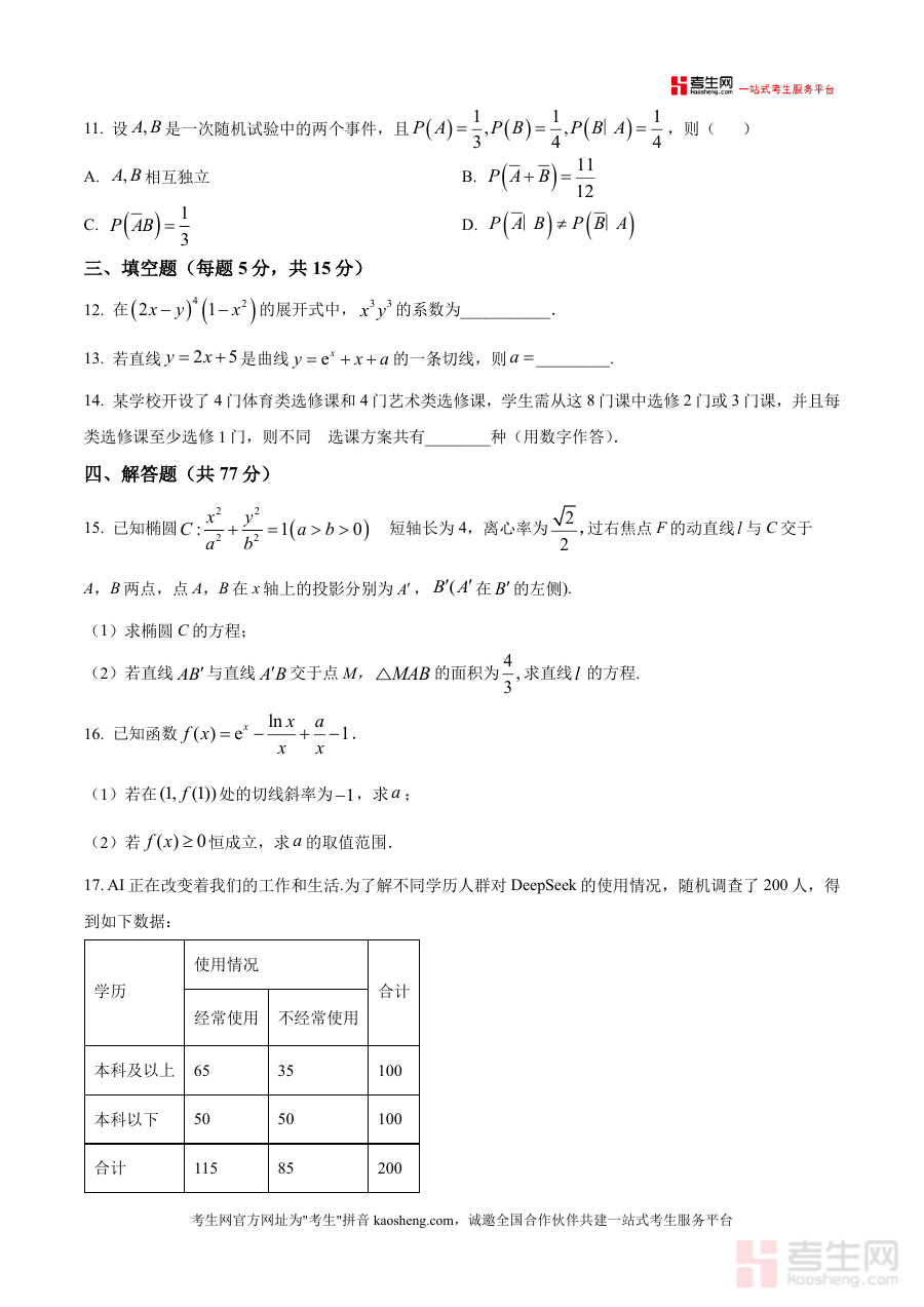 《精品解析:甘肃省渭源县第一中学2025-2026学年高三上学期开学质量检测数学试题(原卷版).docx》是一份针对高三学生开学阶段数学学科的高质量备考资料,包含单选题(40分)、多选题(18分)、填空题(15分)、解答题(77分)四大题型结构完整的检测试卷。资料全面覆盖集合与常用逻辑用语、复数运算、函数单调性与奇偶性、圆锥曲线性质、概率统计应用、立体几何证明与计算等高中数学核心知识点。该资料严格遵循渭源县第一中学教学进度与本地学情特点编制,题型设置与高考真题结构高度契合,题干表述清晰规范且贴近生活实际(如一带一路茶叶出口相关统计题),选项设计兼具典型性与迷惑性,能有效考查学生对基础知识的掌握程度与知识迁移能力。