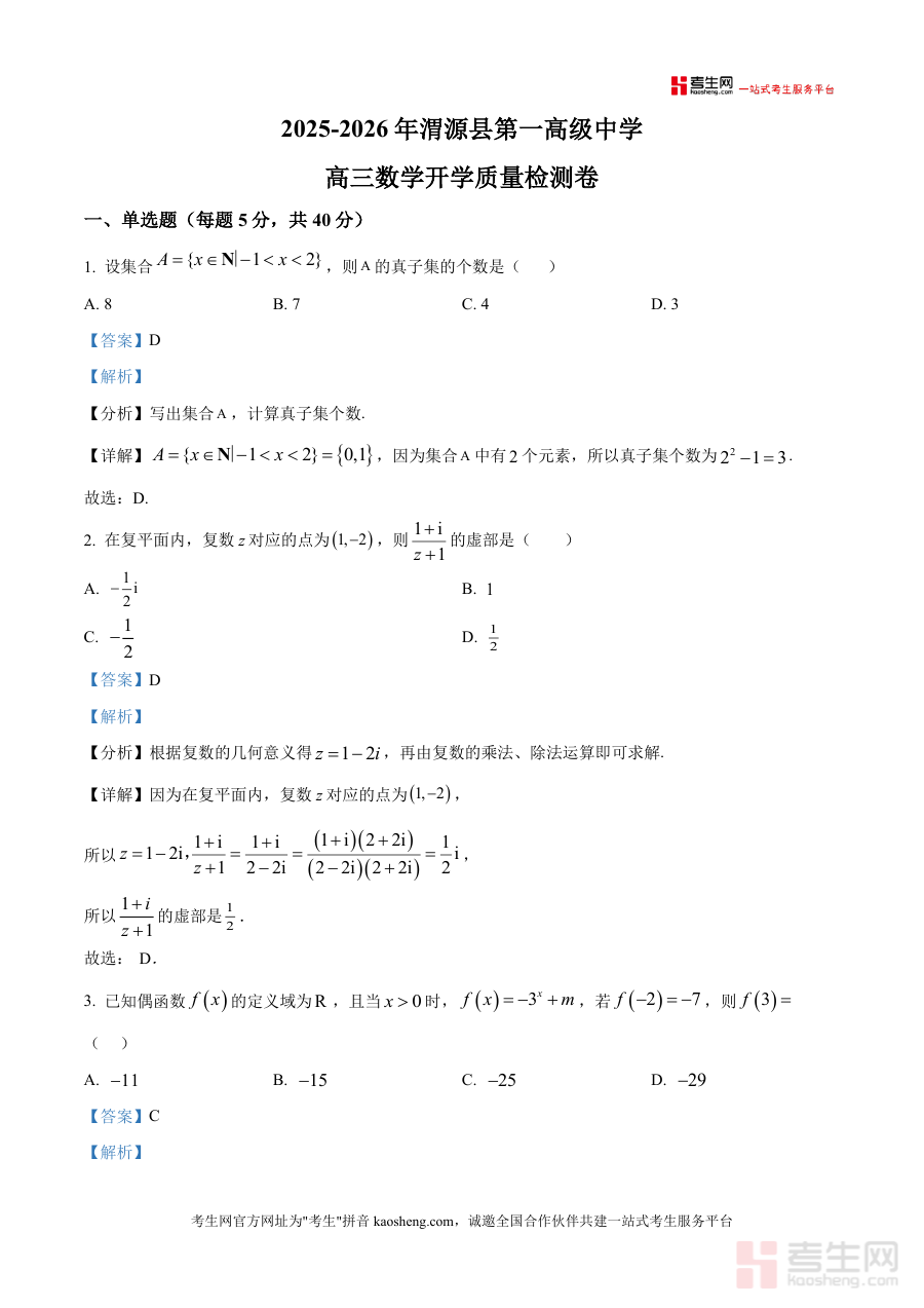本资料适用于甘肃省渭源县第一中学及同类学校的高三学生、高中数学教师及高考备考辅导人员。作为开学质量检测真题解析资料,其必要性在于精准反映学生开学阶段学习状态;不可替代性体现在结合本地教学实际,解析深度契合高考要求;长期价值在于帮助学生巩固基础知识点、培养逻辑解题思维,为后续高考系统复习奠定坚实基础,是高三数学备考阶段不可或缺的数据支撑材料。