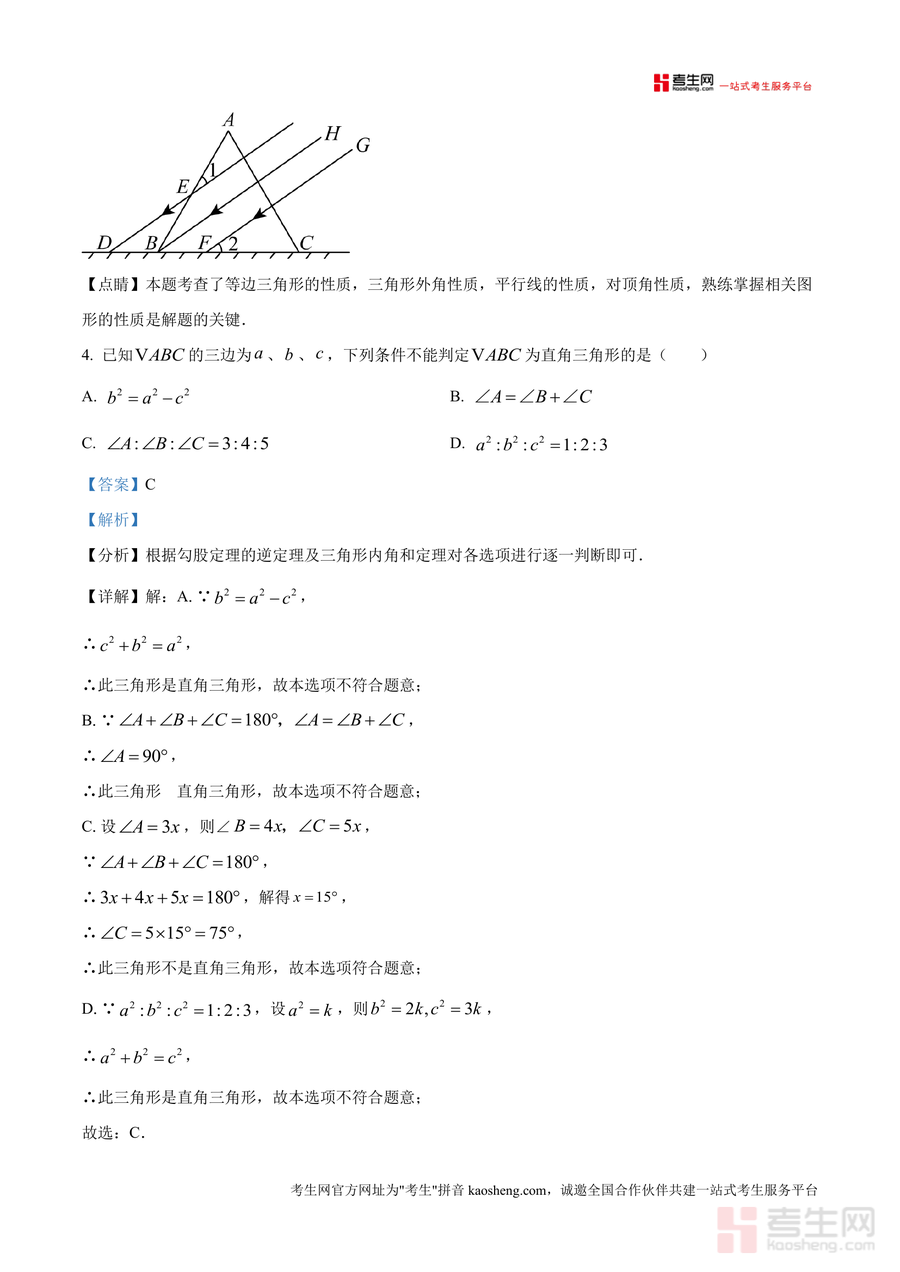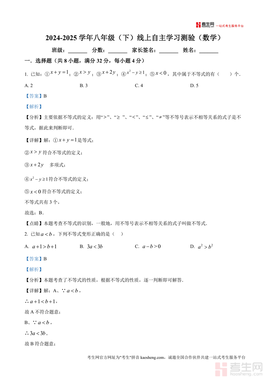 《精品解析:广东省深圳市红岭教育集团2024-2025学年八年级下学期开学考试数学试卷(解析版).docx》是一份针对深圳红岭教育集团八年级学生设计的专业备考资料,包含8道选择题、5道填空题及5道解答题三大题型板块。内容覆盖不等式识别与变形、等边三角形性质应用、勾股定理逆定理验证、一次函数图像分析等核心知识点,特色在于每道题目均配备详细<分析><详解>与<点睛>模块——前者梳理解题思路与考点关联度,后者提炼易错点与方法技巧总结。