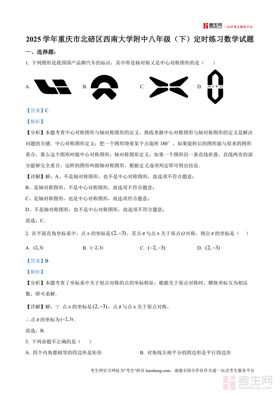 《精品解析:重庆市北碚区西南大学附属中学校2024--2025学年八年级下学期定时练习数学试题(解析版).docx》是一份针对八年级下学期数学核心知识点设计且贴合重庆本地教学实际的高质量真题解析资料。该资料完整收录西南大学附中定时练习原题及对应解析内容,覆盖轴对称与中心对称图形判定、坐标系中点对称特征、特殊四边形性质与判定、一元二次方程根判别式等八年级下册核心考点,每个题目均配有详细考点分析、分步解题过程及易错点提示,解析部分既注重基础概念巩固又强调解题方法迁移,体现附中教学对数学思维培养重视。