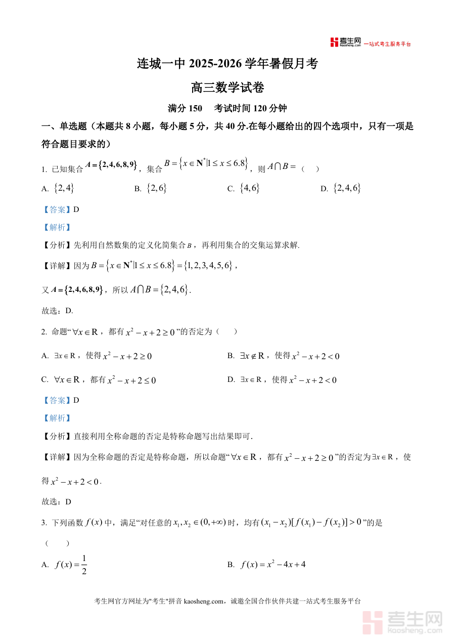 适用人群涵盖连城县第一中学及周边地区高三学生、高中数学教师及所有备考高三数学的学习者。该文件具有不可替代性:真题来源权威且结合本地化教学重点;必要性在于开学初月考是高三复习阶段首次摸底,解析能帮助学生精准定位薄弱环节;长期价值则体现在积累解题方法与思维模式,为后续一轮复习奠定坚实基础,是高三数学备考初期不可或缺的资料。