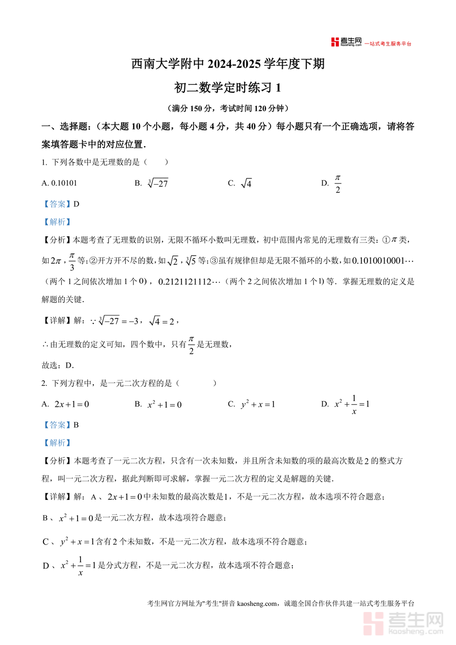 《精品解析:重庆市北碚区西南大学附属中学校2024-2025学年八年级下学期第一次月考数学试卷(解析版).docx》是一份针对西南大学附中八年级下学期阶段性检测需求开发专业数学真题解析资料。该资料完整收录本次月考全部题型——含10道选择题、8道填空题及8道解答题,每道题目均配备深度解析:不仅明确考点方向(如无理数识别、一元二次方程定义等),还提供清晰解题步骤、易错点警示(如分式与二次根式有意义条件叠加时注意事项)及解题技巧总结(如配方法在一元二次方程中的应用)。其特色亮点在于紧密贴合该校教学进度与命题风格,解析过程注重逻辑推导而非单纯给出答案,帮助学生理解考点本质,强化知识迁移能力。