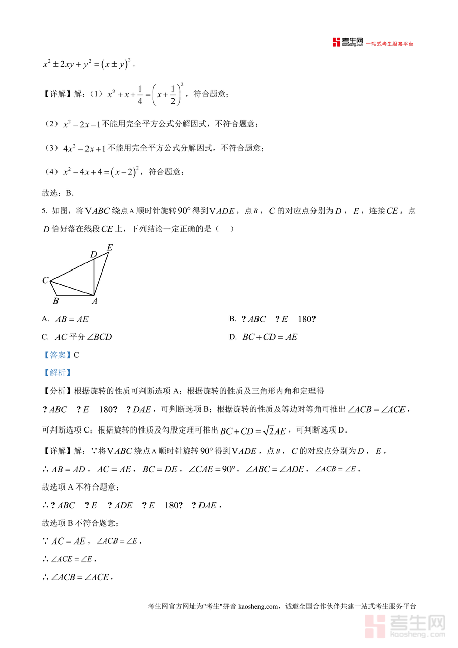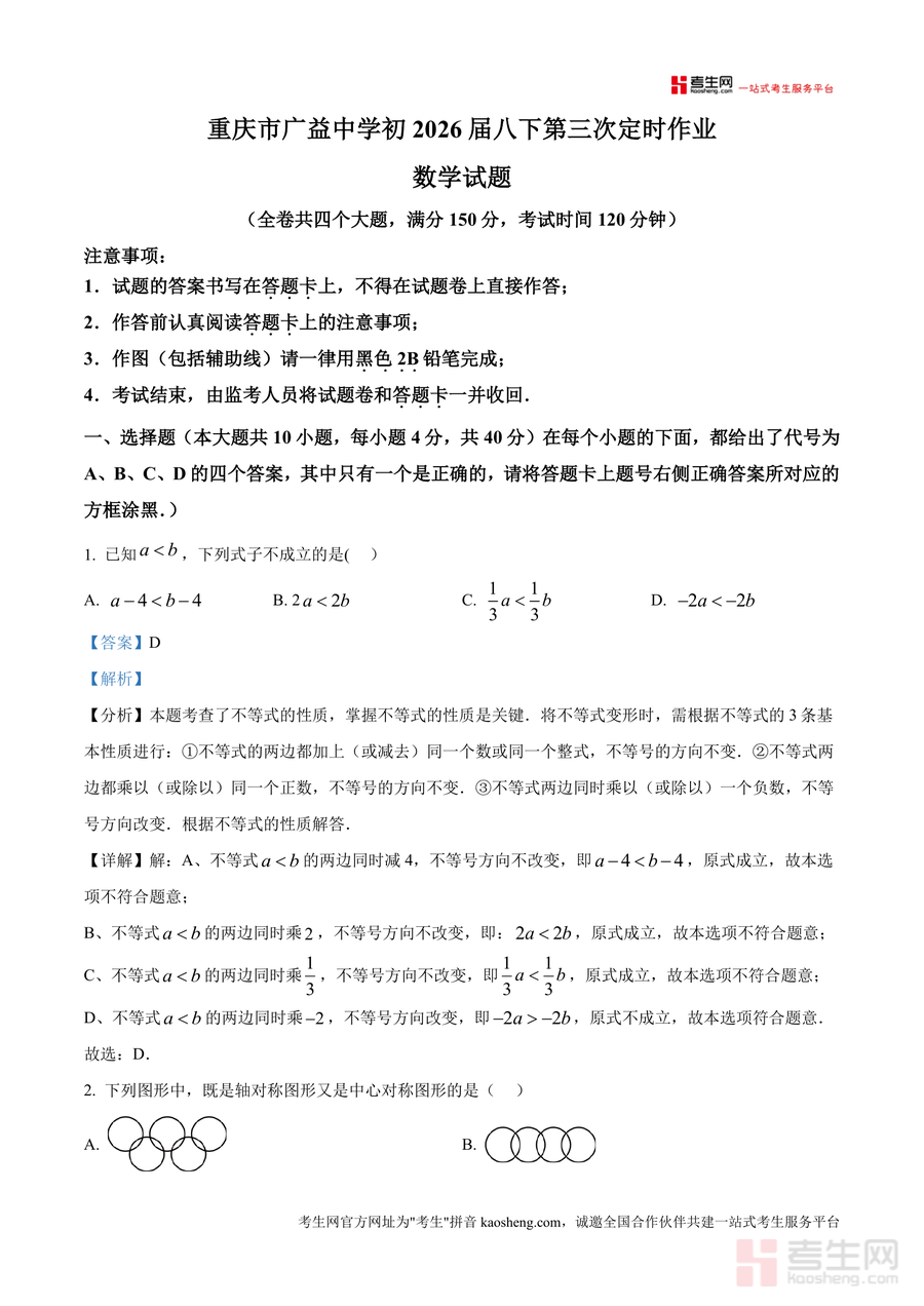 本资料适用人群为重庆南岸区广益中学及周边同类学校初2026届八年级学生、初中数学教师(尤其是八年级段)、关注孩子数学学习进度与效果的家长。作为该校阶段性测试真题权威解析,其具有不可替代性——针对性强且覆盖核心知识点(如旋转性质应用、分式方程增根问题等);长期价值在于帮助学生构建完整数学知识体系,培养逻辑思维能力与应试技巧,为后续九年级数学学习及中考备考奠定坚实基础。