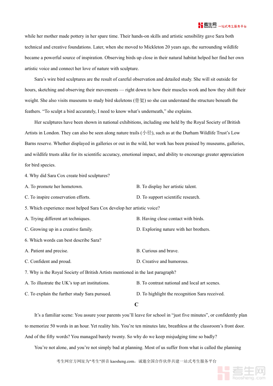 《精品解析:广东省领航高中联盟2025一2026学年高三一轮复习10月阶段检测英语试题(原卷版).docx》是一份针对广东省高三学生一轮复习阶段的高质量英语测评资料,由领航高中联盟联合编制,严格遵循高考英语考试大纲与命题趋势。该资料包含完整的试卷结构,满分120分、考试时长120分钟,涵盖阅读、语言知识运用等核心模块(如阅读部分收录了关于古代体育文化及鸟类雕塑艺术家的真实文本),题型设计贴合高考真题模式,能有效检验学生一轮复习的知识掌握程度与技能应用水平。其特色在于结合区域教学实际,融入广东本地教育联盟的教研成果,为学生提供具有权威性与针对性的备考资料参考。