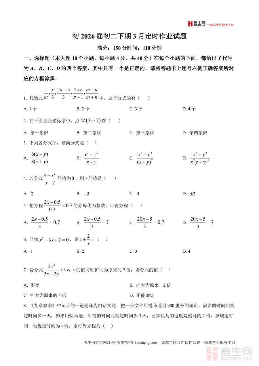 《精品解析:重庆市朝阳中学教育集团2024-2025学年八年级下学期3月月考数学试题(原卷版).docx》是一份针对重庆本地八年级学生数学阶段性学习检测的优质备考资料。它聚焦八年级下册数学核心知识点与考点分布,包含选择题(10题40分)、填空题(8题32分)、解答题(8题78分)三大题型共26道题目,内容覆盖分式概念与运算、平面直角坐标系应用、函数解析式构建与图像分析、分式方程求解、不等式组综合应用等重点模块,还融入《九章算术》相关应用题等特色题型,贴合重庆中考命题趋势与朝阳中学教育集团教学实际,能精准反映学生阶段性学习成果与知识掌握程度。