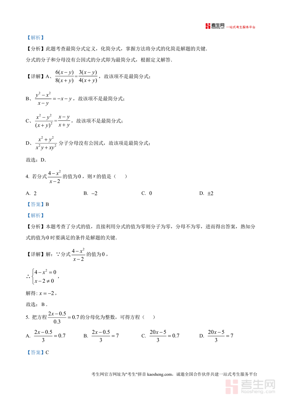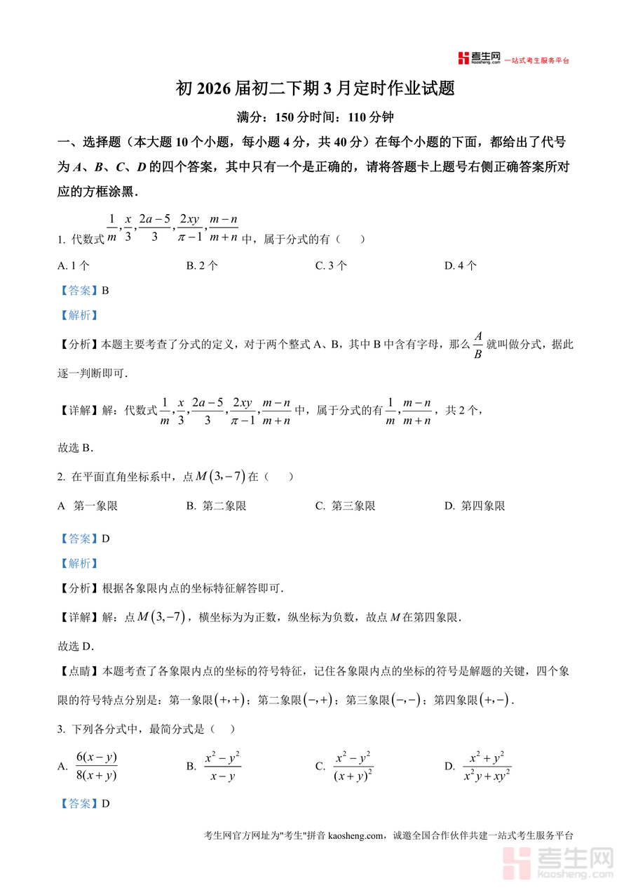 《精品解析:重庆市朝阳中学教育集团2024-2025学年八年级下学期3月月考数学试题(解析版)》是一份聚焦八年级下学期数学核心知识点与应试能力提升优质备考资料。文件包含满分150分、时长110分钟完整试题及逐题解析,覆盖分式定义判断、平面直角坐标系象限识别、最简分式筛选等基础考点,以及函数图象分析、整式加减规律探索、分式方程应用题建模等综合题型。特色亮点在于每道题配备详细分析步骤、考点标注及易错点提醒,如分式值为零需满足分子为零且分母不为零等关键细节解读,助力学生精准把握命题意图与解题逻辑。