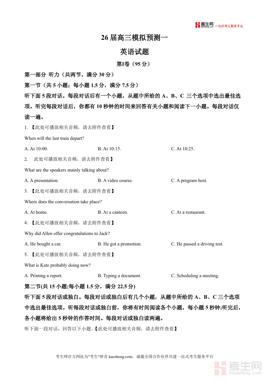《精品解析:2026届四川省眉山市东坡区眉山中学校模拟预测一英语试题(原卷版).docx》是一份针对2026届高三学生的高质量英语备考资料,严格遵循高考英语命题规范与题型结构,涵盖听力、阅读等核心模块。试卷内容贴合四川地区教学实际,融入本土文化元素(如阅读部分涉及四川道孚亚丁、乐山大佛等特色景点介绍),同时保持题型设置的科学性与权威性;听力部分提供完整音频提示与标准化题目设计,阅读部分包含多样化文本类型(记叙文、说明文等),全面覆盖高考英语核心考点,为学生提供真实的模拟考试体验。