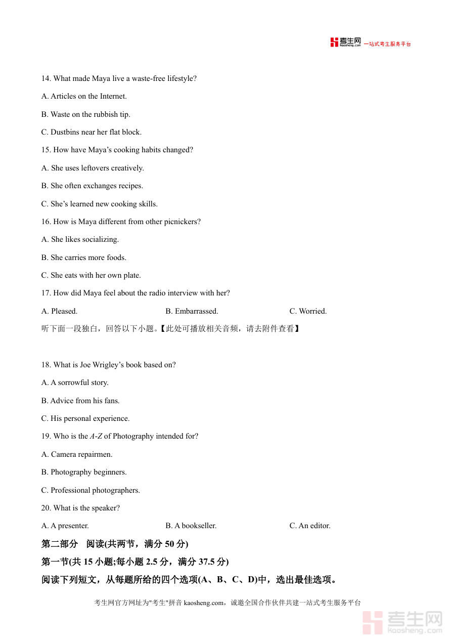 该资料核心用途为辅助高三学生进行高考英语考前模拟训练,可应用于课堂限时测试、课后自主练习及教师教学评估等场景。其用户价值体现在通过高度仿真的试题设置,帮助学生提前适应高考考试节奏与题型难度,精准定位听力理解、阅读理解等模块的薄弱环节;备考优势在于试卷内容紧密结合眉山市及四川省高考英语命题趋势,融入本土文化素材,能有效提升学生的应试能力与答题策略运用水平,为后续复习提供明确方向。