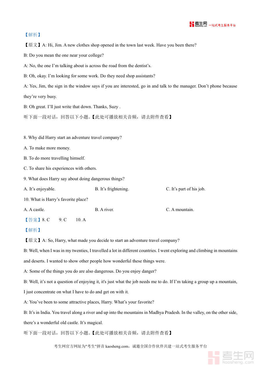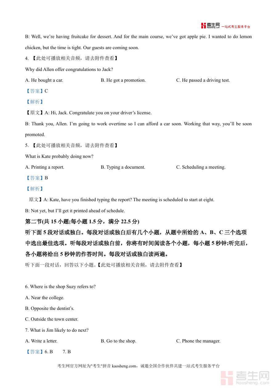 该资料核心用途为辅助高三学生开展针对性复习与模拟训练,适用场景包括课堂同步练习、课后自主巩固及考前冲刺提升。对学生而言,通过逐题解析可快速掌握听力题型的答题策略,如时间数字类题目快速定位、场景推断类题目逻辑分析等;对教师而言,可作为教学参考素材,助力设计精准化听力训练课程。其备考优势在于精准匹配眉山中学校教学进度与考试要求,解析内容详实且贴近学生实际需求,能有效提升学生的应试能力与解题效率。