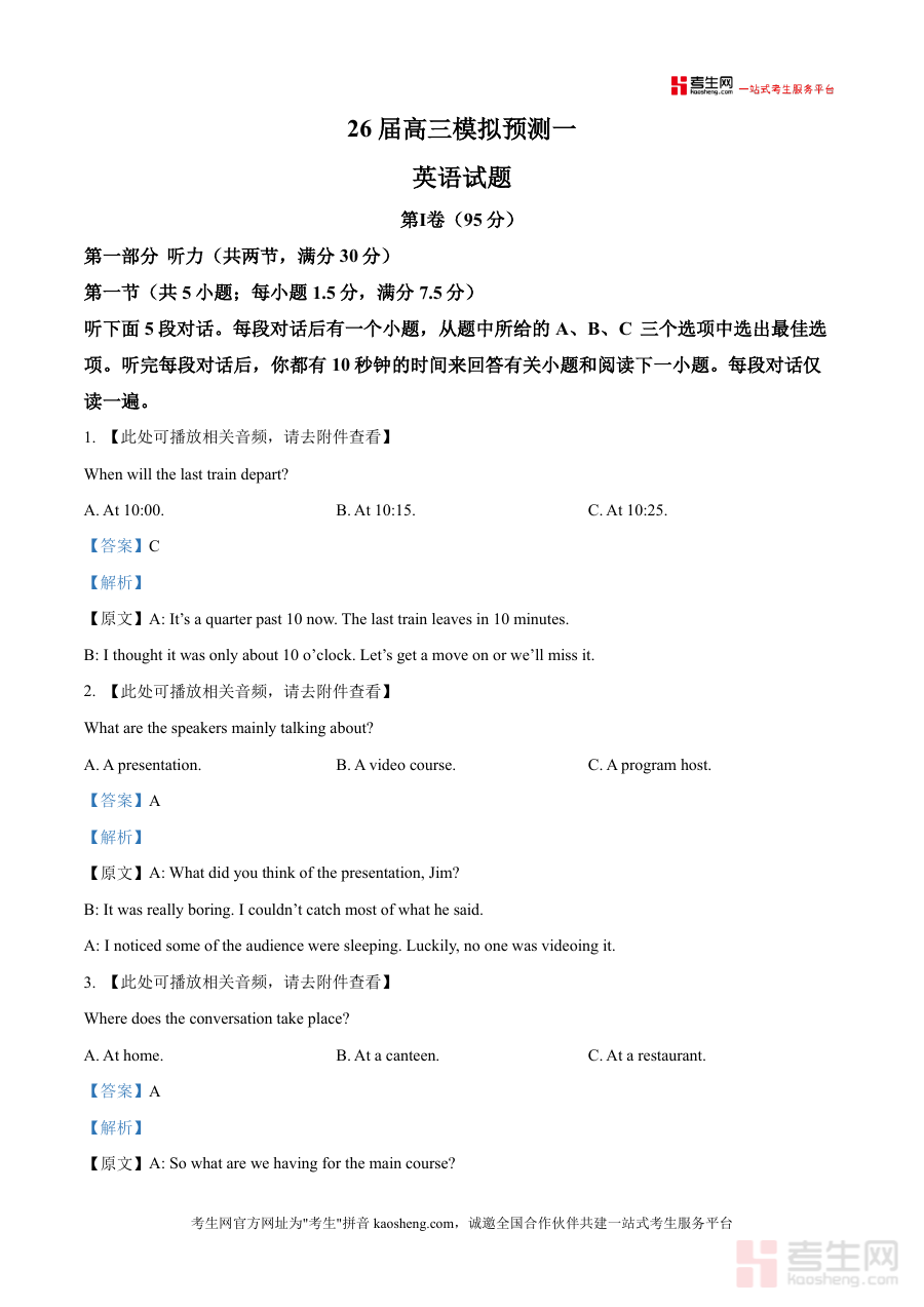 《精品解析:2026届四川省眉山市东坡区眉山中学校模拟预测一英语试题(解析版)docx》是一份聚焦高三英语备考的专业资料,针对眉山中学校2026届首次模拟预测英语试题进行全面深度解析。资料覆盖听力(含两节共20小题)等核心题型,每道题目均提供完整对话/独白原文、准确答案及逻辑严谨的解析过程;特色亮点在于结合本地教学实际与高考命题趋势,将听力场景还原、关键信息捕捉技巧与考点分析有机融合,帮助学生清晰理解题目考查逻辑与答题思路。
