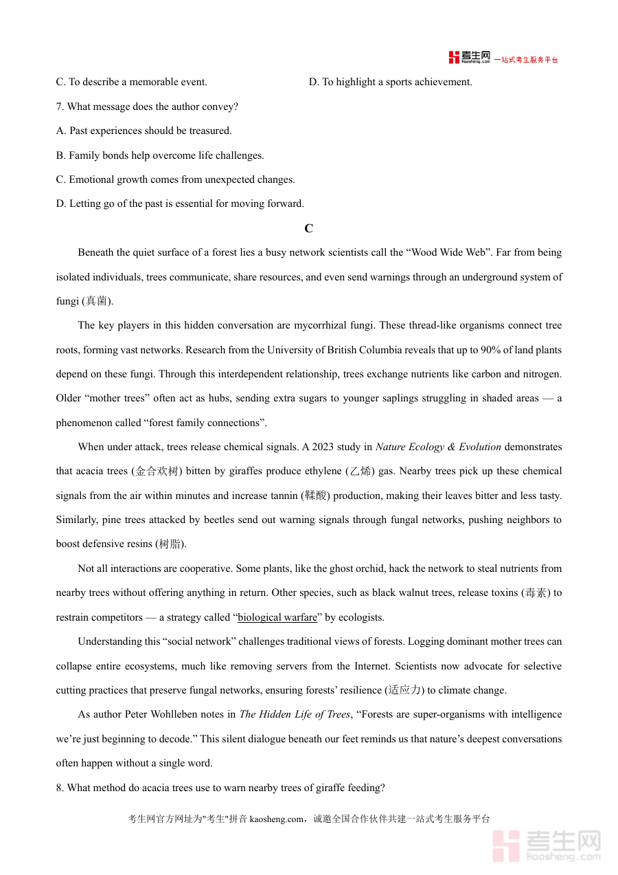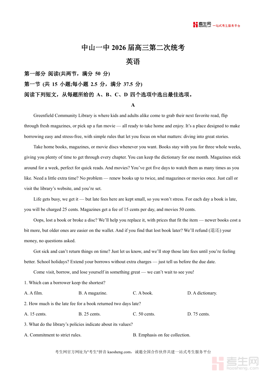 《精品解析:2026届广东省中山市第一中学高三第二次模拟预测英语试题(原卷版)》是一份针对2026届高三学生的高质量模拟考试资源,由广东省中山市第一中学编制,聚焦高考英语的核心考点与题型。该试卷涵盖阅读理解(含社区图书馆服务、个人成长故事、生态网络等多元主题)、语言知识运用等典型高考模块,严格遵循最新高考英语大纲要求,保留了原卷的真实格式与命题风格,为学生提供贴近实战的考试体验。