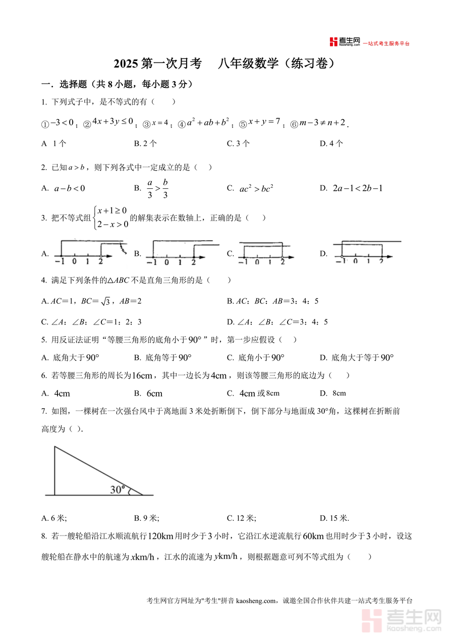 《精品解析:广东省深圳市罗湖区罗湖实验学校2024-2025学年下学期第一次月考八年级数学(练习卷)(原卷版).docx》是一份聚焦八年级下学期数学核心知识点的针对性备考资料,精准贴合深圳罗湖区罗湖实验学校教学进度与月考命题方向。资料涵盖选择题(8小题)、填空题(5小题)、解答题(8小题)三大题型,内容涉及不等式性质与解集表示、直角三角形判定与应用、等腰三角形周长计算、反证法逻辑推理、一次函数与不等式关系分析、几何作图及综合应用题等八年级数学关键考点。其特色在于严格遵循该校月考题型结构与分值分布,原卷版呈现形式便于学生模拟真实考试场景,快速适应本校命题风格。