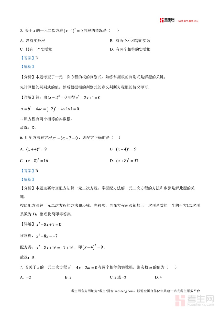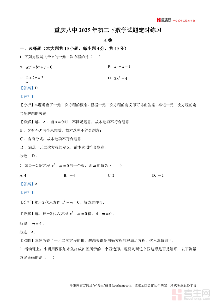 《精品解析:重庆市第八中学校2024-2025学年八年级下学期数学试题定时练习(解析版).docx》是一份针对重庆八中初二下学期数学阶段性学习设计的数据化备考资料。文件包含A卷(10道选择题、4道填空题、3道解答题)与B卷(5道填空题等)完整试题及详细解析部分;解析内容覆盖一元二次方程概念、根判别式、配方法求解,特殊四边形(矩形、正方形)判定与性质等核心知识点,并通过“分析-详解-点睛”结构呈现每个题目的考点、解题思路及易错点提示,贴合重庆八中教学特色与命题方向。