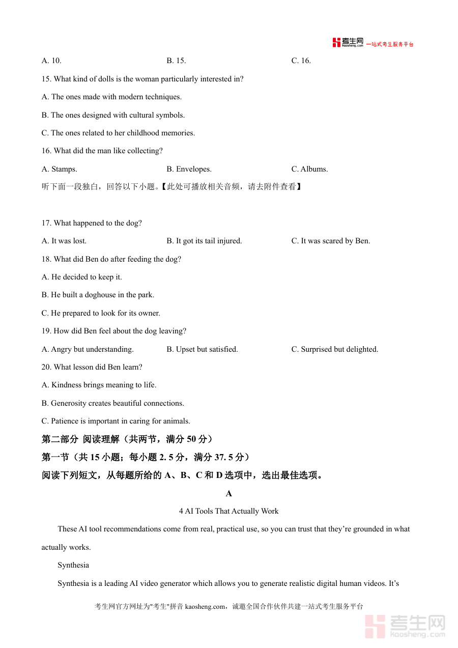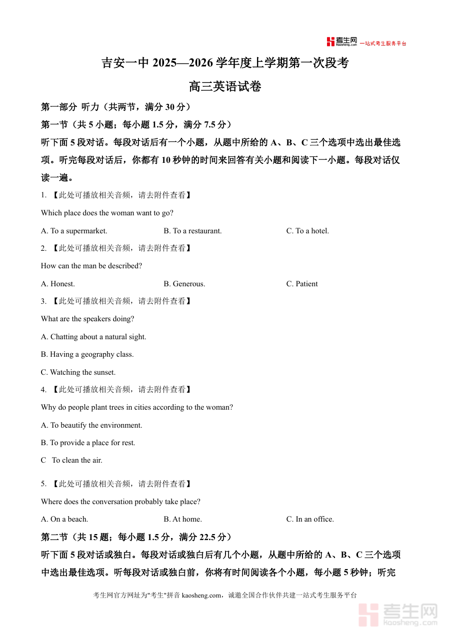 《精品解析:2026届江西省吉安市第一中学高三第一次段考英语试题(原卷版)》是一份针对高三学生英语备考的高质量真题资料。该资料完整呈现了吉安一中2025—2026学年度上学期第一次段考的英语试卷原貌,涵盖听力(30分)、阅读理解(50分)等核心题型板块。听力部分包含5段短对话、5段长对话或独白,题目设置贴近日常场景与文化背景;阅读理解第一节以“4 AI Tools That Actually Work”为主题,考查学生对实用AI工具信息的提取与分析能力。资料特色在于保留了考试的原始结构与难度梯度,配套听力音频附件可辅助学生进行沉浸式训练,是兼具真实性与实用性的备考资源。