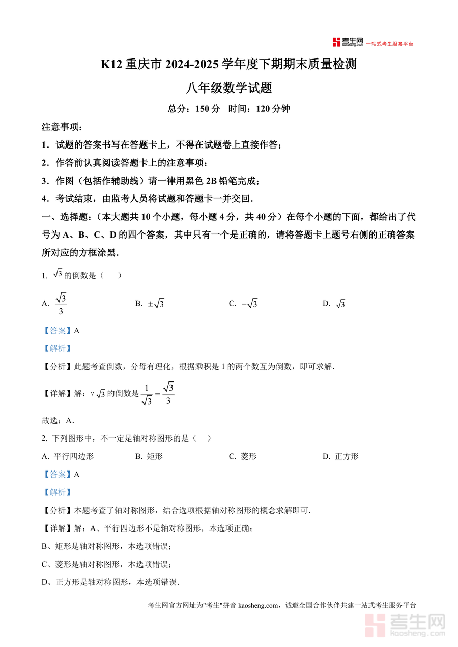 《精品解析:重庆市巴南区2024-2025学年八年级下学期6月月考数学试题(解析版)》是一份针对巴南区八年级学生数学学科的优质备考资料,涵盖该学期核心知识点如勾股定理应用、一次函数图象分析、特殊四边形判定等,试题结构与本地月考完全一致(150分总分、120分钟时长)。其特色亮点在于每道题配备详细解析:选择题部分对轴对称图形判定、二次根式有理化因式等考点进行深度拆解;填空题结合正比例函数定义及不等式组整数解问题展开分析;解答题则针对几何辅助线构造、分式化简求值等题型提供完整解题步骤与易错点提示,有效帮助学生掌握核心解题方法。