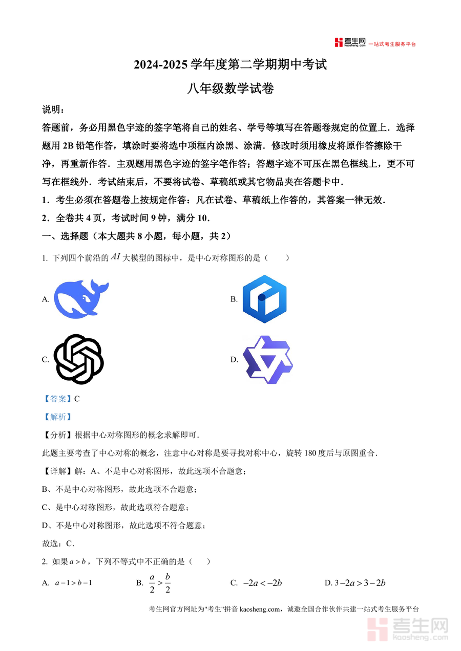 《精品解析:广东省深圳市福田外国语学校2024-2025学年八年级下学期期中数学试题(解析版).docx》是一份聚焦深圳本地名校期中真题、兼具权威性与实用性的备考资料。该资料包含选择题、填空题、解答题三大题型共17道题目及配套详细解析,覆盖中心对称图形判断、不等式性质应用、旋转性质综合、因式分解等八年级下册核心知识点;其特色亮点在于解析部分不仅明确给出答案,还融入考点分析、解题思路推导及易错点提示,如选择题第6题结合旋转性质与勾股定理展开多步骤解析,帮助学生掌握综合题型解题方法,同时标注关键得分点。