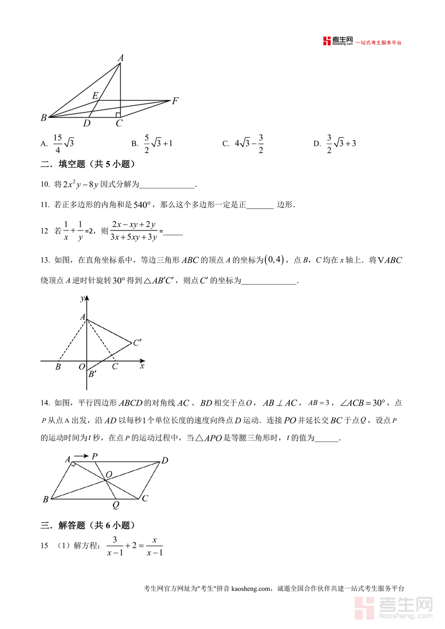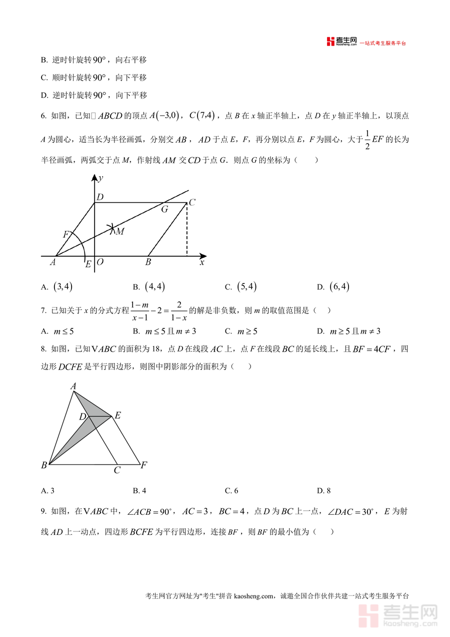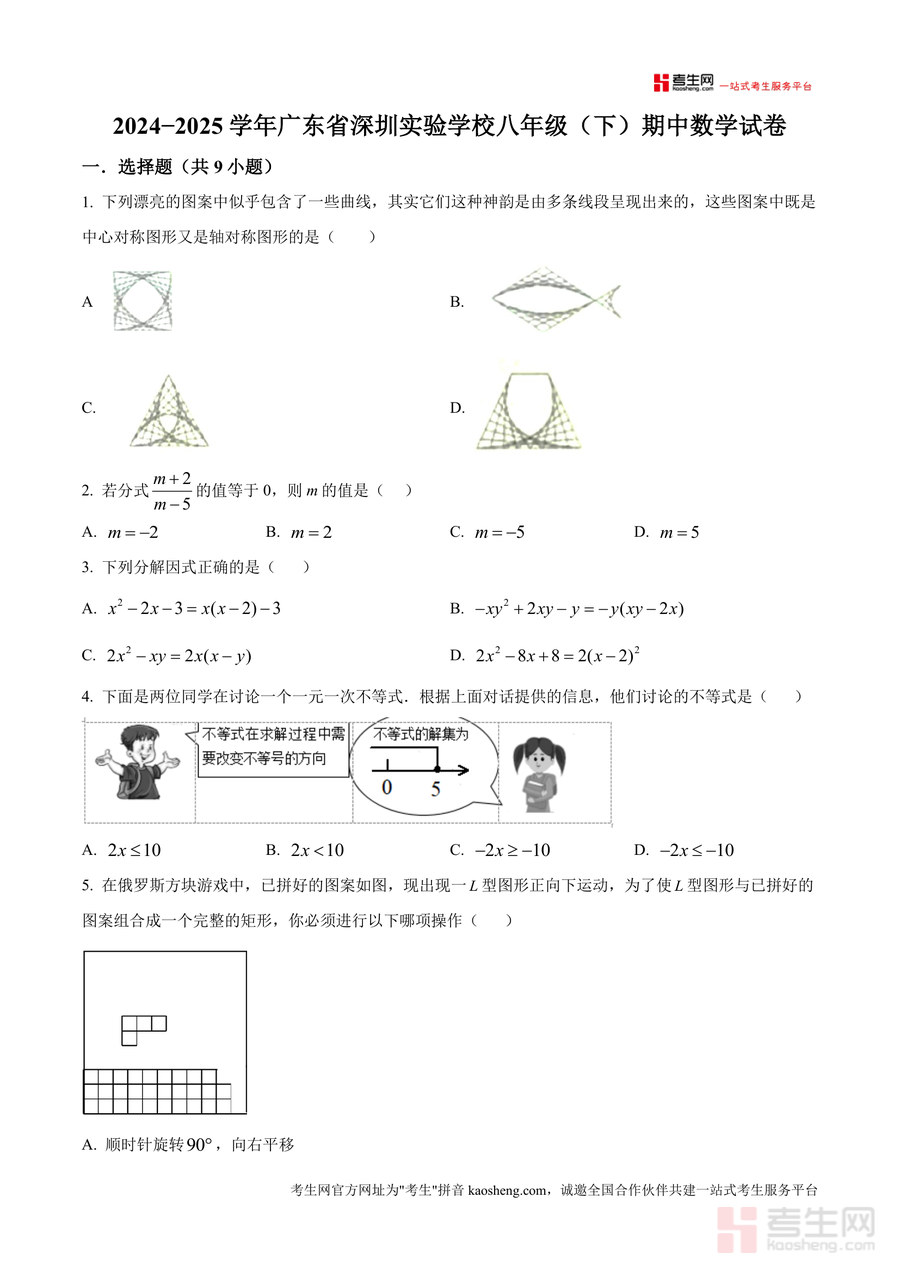 《精品解析:广东省深圳实验学校2024-2025学年下学期八年级期中数学试卷(原卷版).docx》是一份聚焦深圳实验学校八年级下学期期中数学考试的权威备考资料。文件包含9道选择题、5道填空题及6道解答题,覆盖中心对称与轴对称图形识别、分式方程解值判断、因式分解正确性验证、一元一次不等式组求解、几何图形旋转平移应用、平行四边形性质探究及动点最值问题等核心考点,严格遵循该校教学大纲与命题规律。其题型结构与分值占比完全还原真实考试场景,能帮助使用者精准感知考试难度与考点侧重。