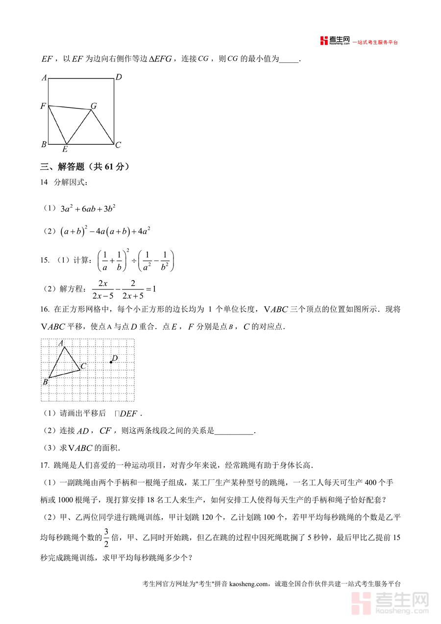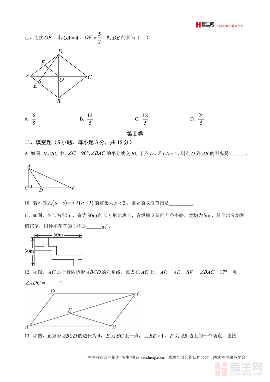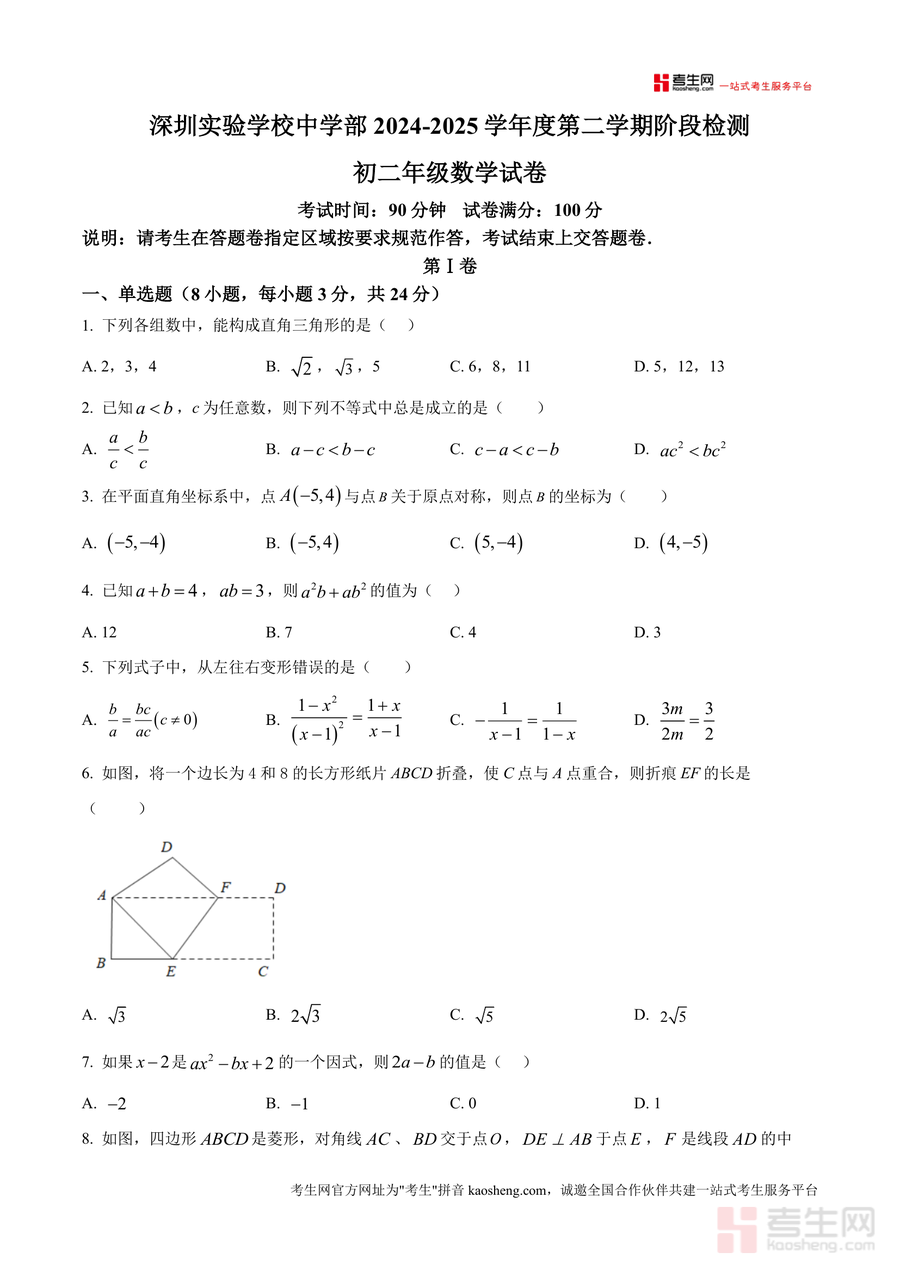 《精品解析:广东省深圳实验学校中学部2024-2025学年八年级下学期期中数学试题(原卷版).docx》是一份针对深圳实验学校中学部八年级下学期期中数学考试设计的权威真题原卷资料。该资料严格遵循该校期中检测命题规范,包含考试时间90分钟、满分100分的完整试卷结构:第Ⅰ卷为8道单选题(共24分)、第Ⅱ卷涵盖5道填空题(共15分)及7道解答题(共61分)。试题内容覆盖直角三角形判定、不等式性质、平面直角坐标系对称、因式分解、几何图形折叠与最值等八年级下册核心知识点,且贴合该校教学进度与命题风格,具有高度的针对性与参考价值。