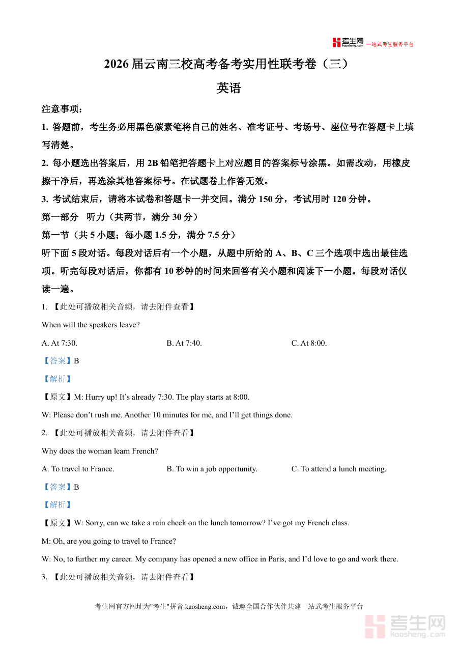 《精品解析:云南三校(昭通一中等)2025-2026学年高考备考实用性联考卷(三)英语试题(解析版)》是一份聚焦云南地区高三英语备考需求的专业资料。它包含完整的联考英语试卷(涵盖听力、阅读等全部题型)及每道题目的深度解析——不仅给出标准答案,还追溯原文语境、分析错误选项成因,并标注听力音频的获取途径。作为优质备考资料,其核心特色在于贴合云南高考英语命题趋势,通过真实联考真题解析帮助学生熟悉考试节奏,同时融入实用答题技巧指导,有效提升应试能力。