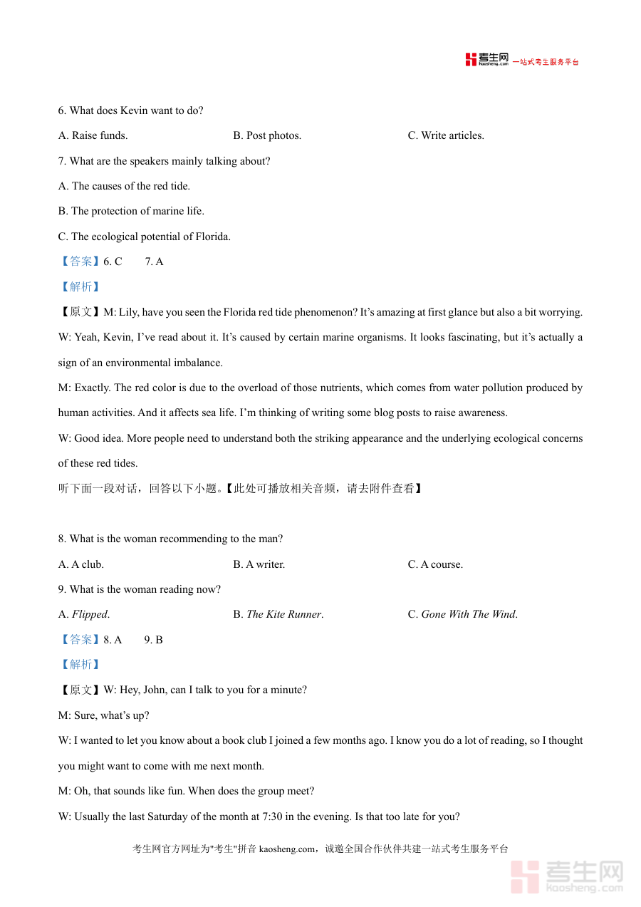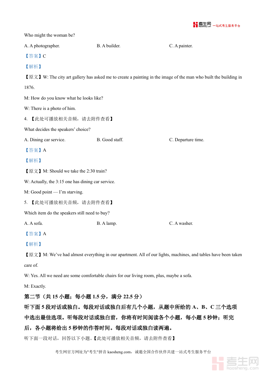 该资料适用于多种场景:学生可用于课后自主练习以巩固知识点,教师可将其作为课堂教学案例分析的素材,学校可组织模拟考试以检验复习效果。其核心价值在于帮助用户精准定位知识漏洞(如听力中的时间计算类题目),通过详细解析掌握解题逻辑;备考优势体现在它能让学生在模拟真实考试环境中提升时间管理能力,同时通过错题分析强化薄弱环节,为高考英语冲刺提供科学支撑。