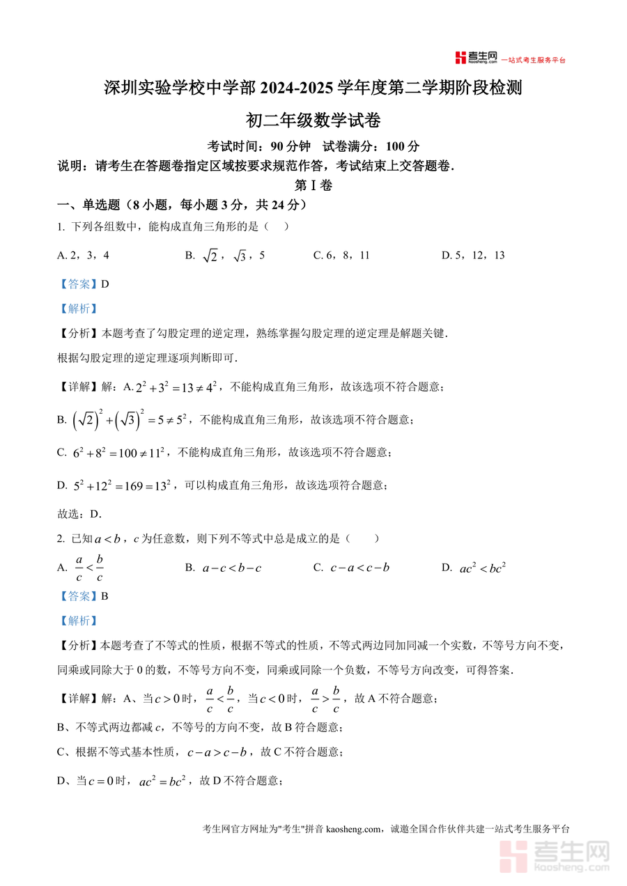 本资料适用于深圳实验学校八年级学生及目标同类学校期中数学考试备考者。其必要性体现在真题权威性与解析专业性可引导学生精准把握考试方向;不可替代性在于针对该校特定试题设计深度讲解,避免泛泛而谈;长期价值则通过系统解析培养学生逻辑思维与数学解题能力——不仅服务本次期中备考需求,更能为后续学习奠定坚实基础,具有持久参考意义。